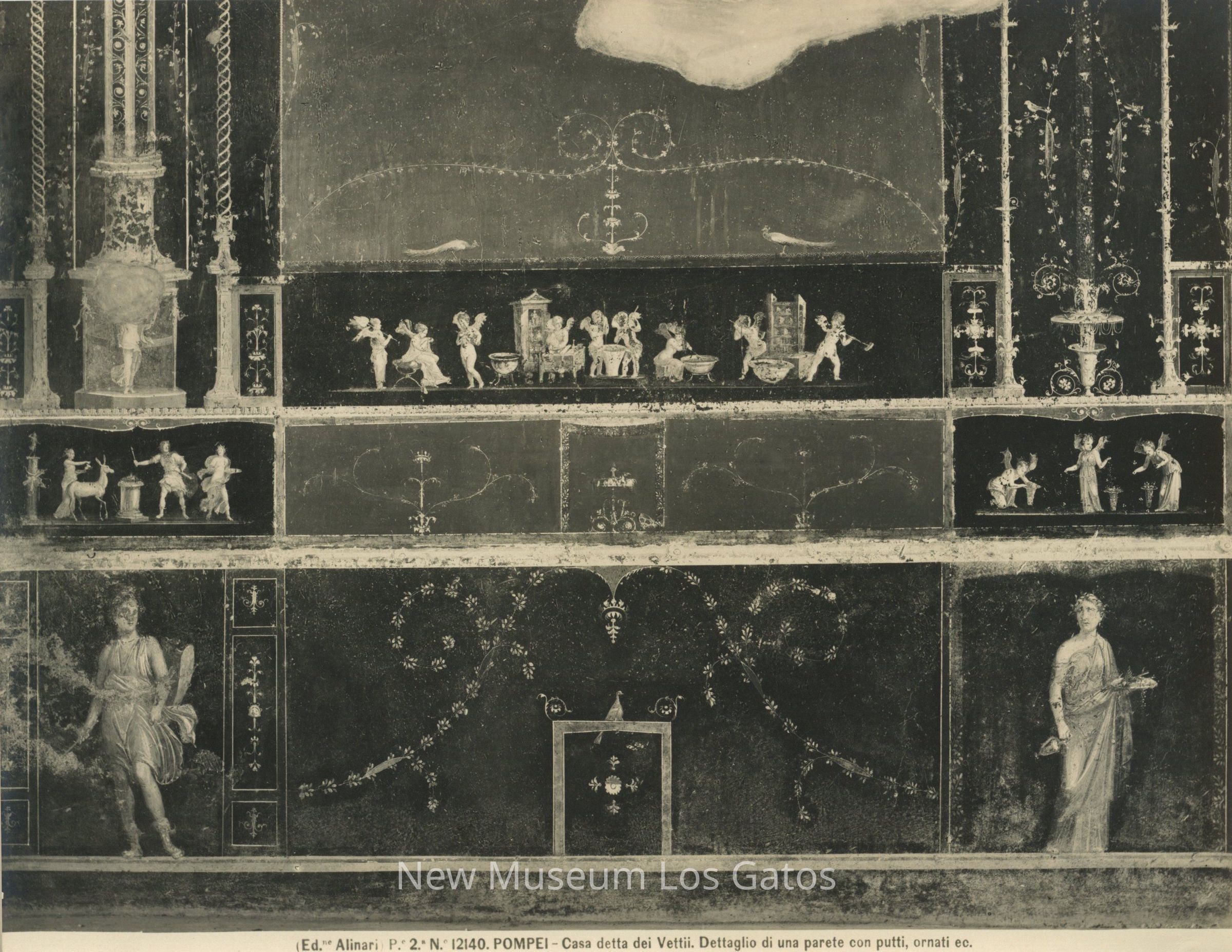 Black and white photograph of a fresco on the wall of "House of the Vettii," in Pompeii, Italy. The painting depicts human figures, flowers, peacocks, and cherubs.Collection