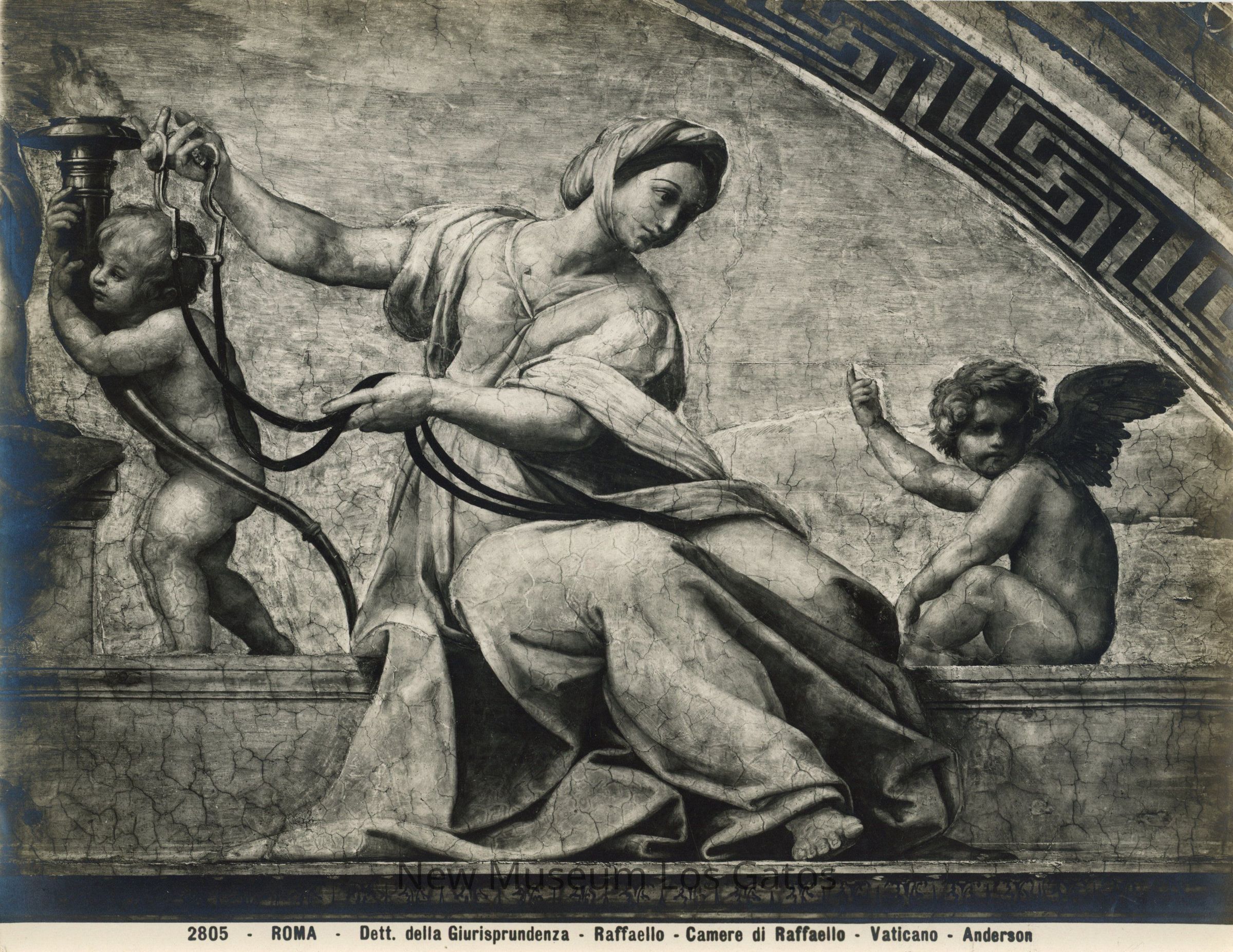 Black and white detail photograph of the fresco "Cardinal and Theological Virtues," by Raphael. The fresco depicts the three cardinal virtues, personified as women. The detail shows Temperance, flanked by cherubs.Collection