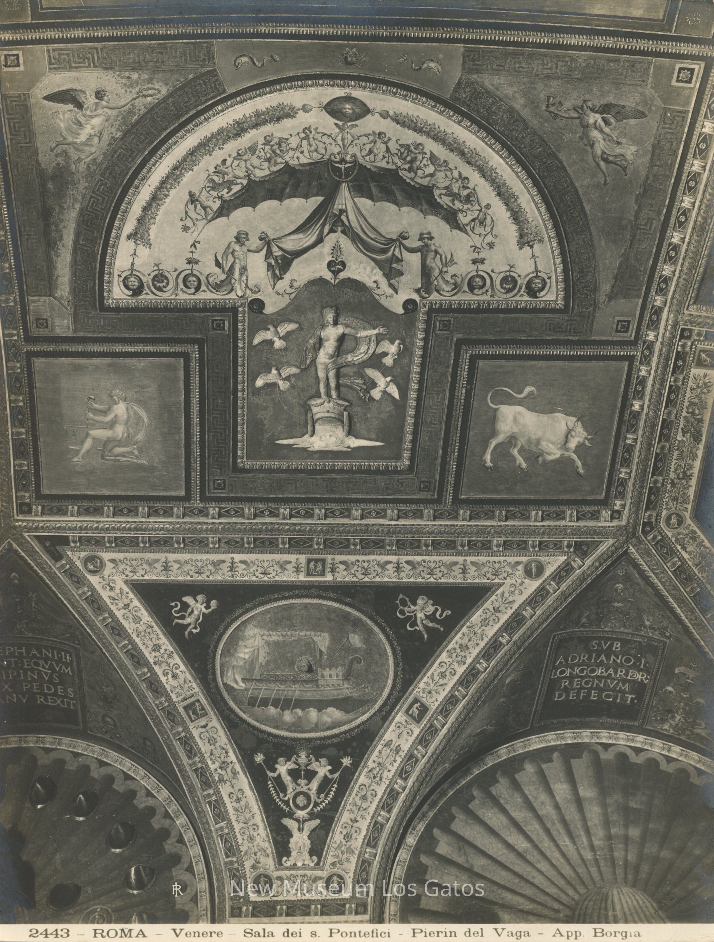 Black and white photograph of the fresco, "Perino Del Vaga", in Sala dei Pontefici, Vatican Palace, Rome. The fresco depicts human figures, florals, a Roman ship, and animals.Collection