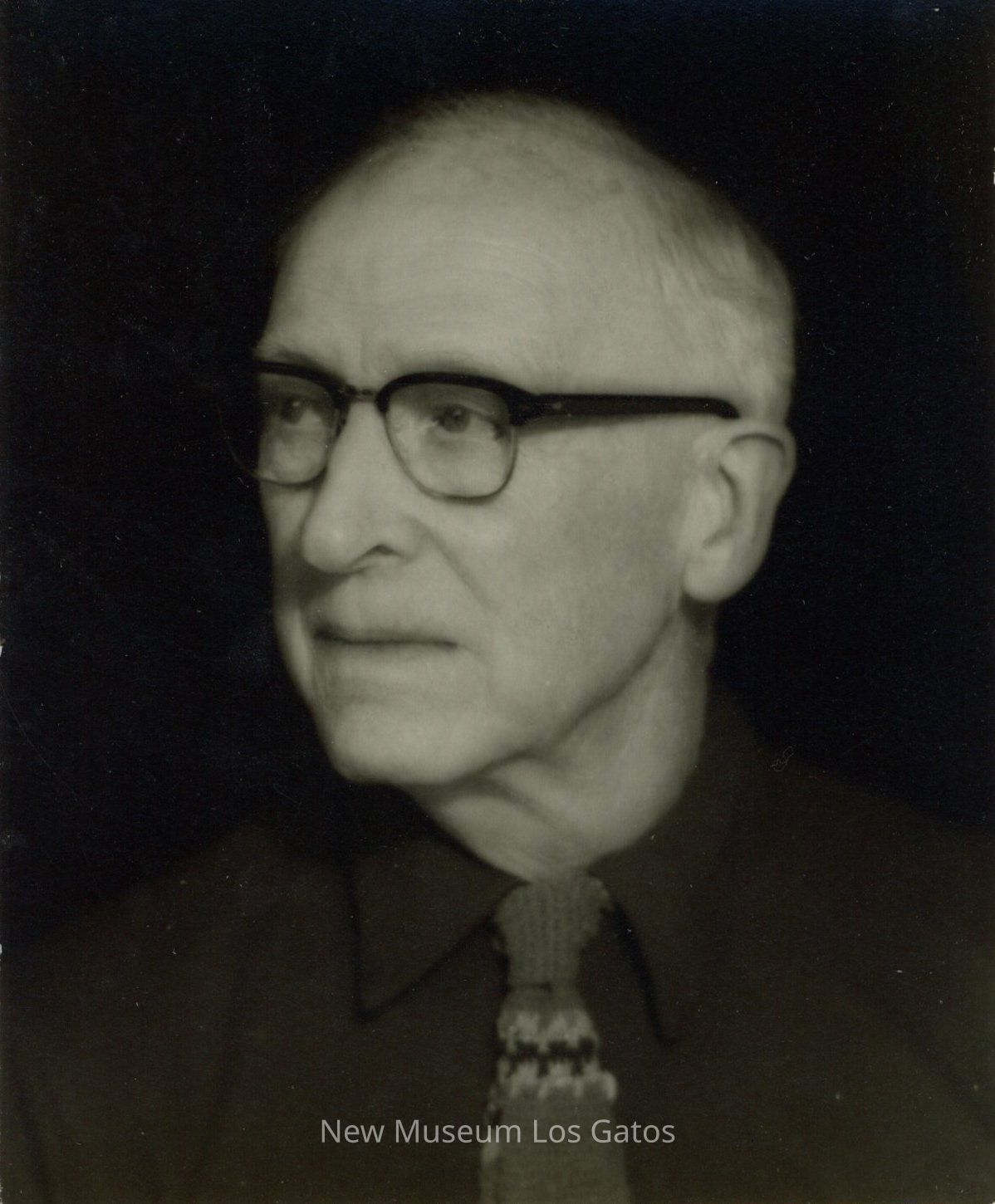 A black and white photograph of George Dennison. He is wearing thick black-rimmed glasses and facing towards the right. The photograph is undated.Photograph Details