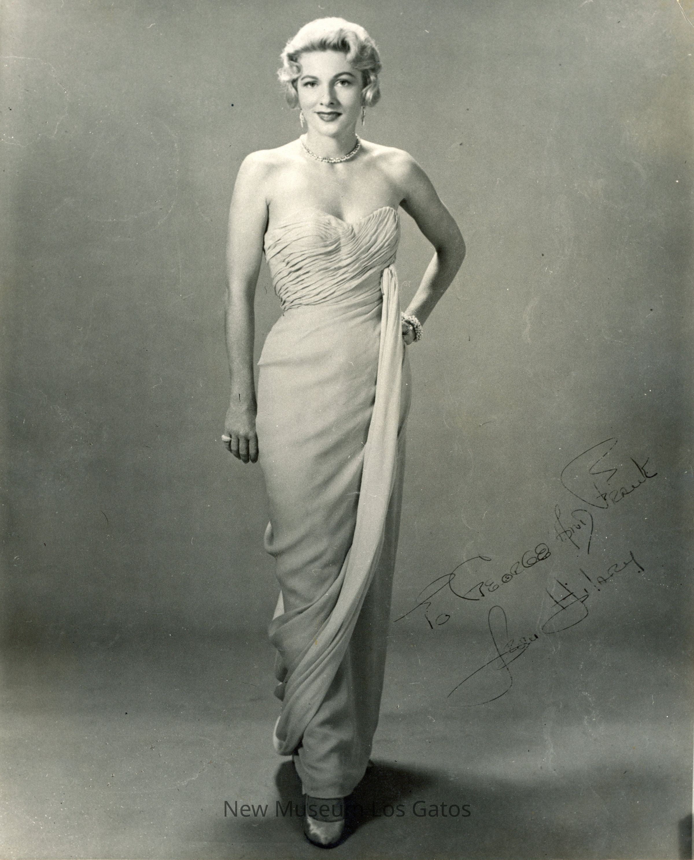 Black and white print of a photograph of Hilary Brooke. The photograph is autographed in the lower right section. She standing in the center, in a light colored dress.Photograph Details