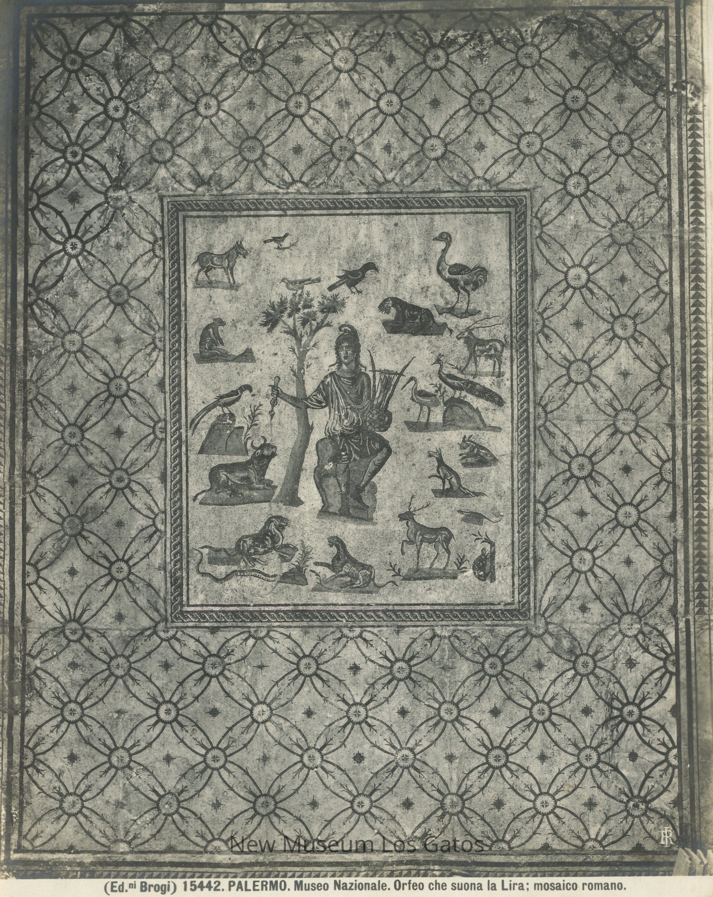 A black and white photograph of a floor mosaic depicting Orpheus, the roman god of art and animals. The figure is Orpheus is flanked by animals, charmed by the music of his lyre. The mosaic is held in Palermo, Italy.Collection