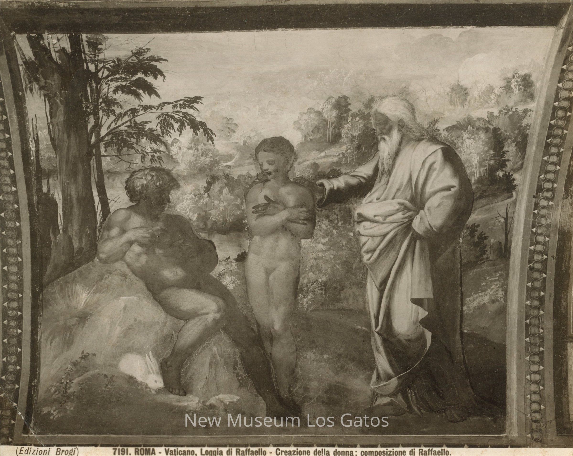 Black and white photograph of a painting featuring three figures. The figure at the left reclines over a stone, with a rabbit at his foot. A young female figure stands in the middle, her arms over her chest. The right figure is a bearded man, his hand on the middle figure's shoulder. The figures are flanked by bushes and trees. The painting is in a decorated frame.Collection