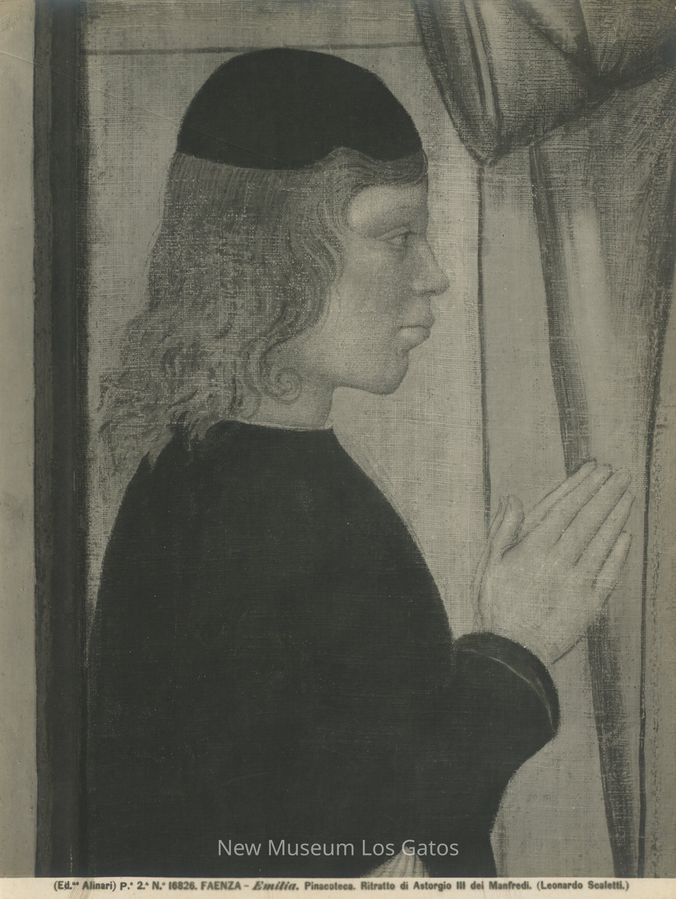 Black and white photograph of a painting "Astorgio III Manfredi," Lord of Faenza, by Scaletti Leonardo di Zanino. The figure is looking to the right, with his hands clasped in prayer.Collection
