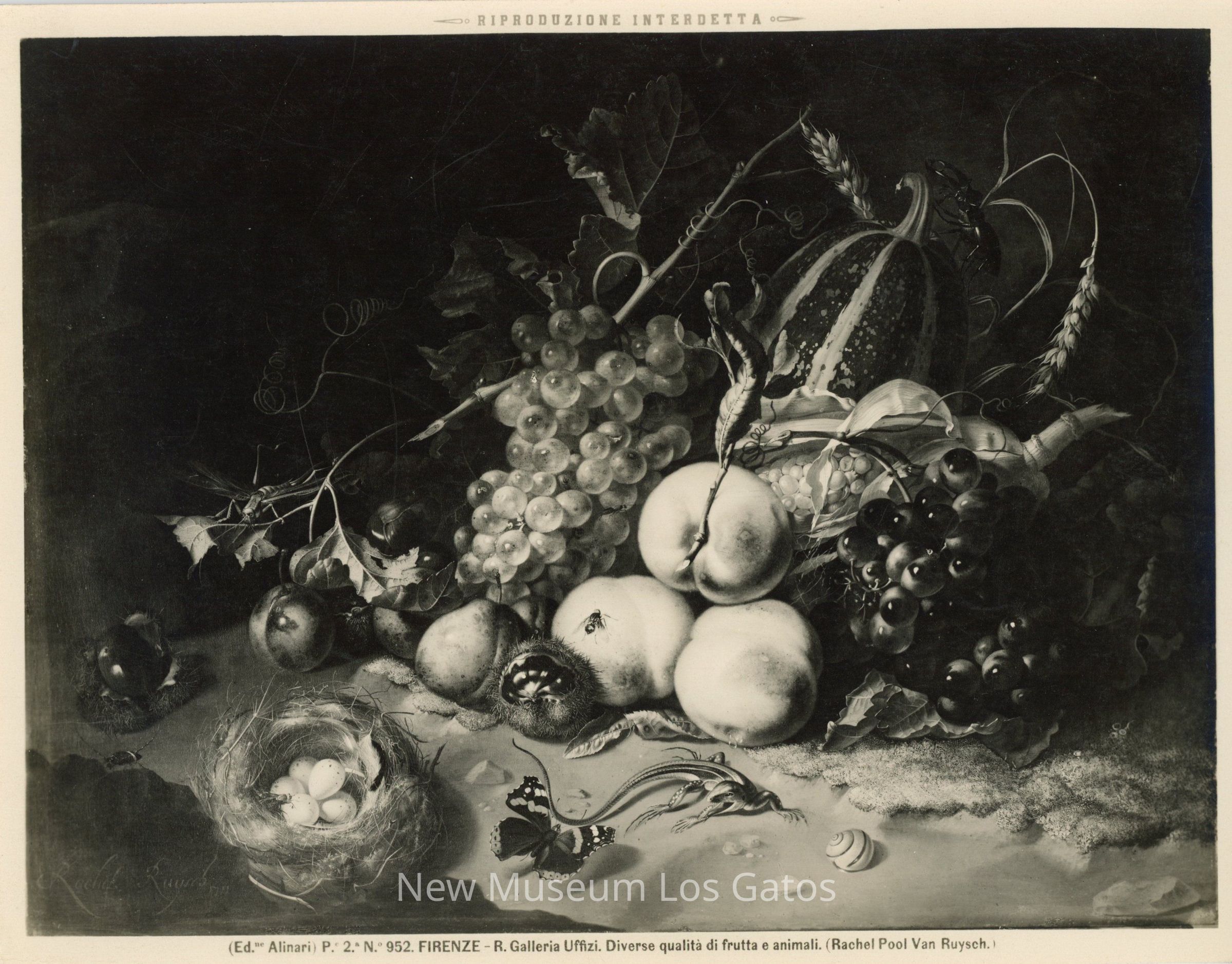 Black and white photograph of the painting "Fruits and Insects" by Rachel Ruyseh. The painting is of a large still-life of fruit, with lizards and insects. A bird's nest is in the foreground.Collection