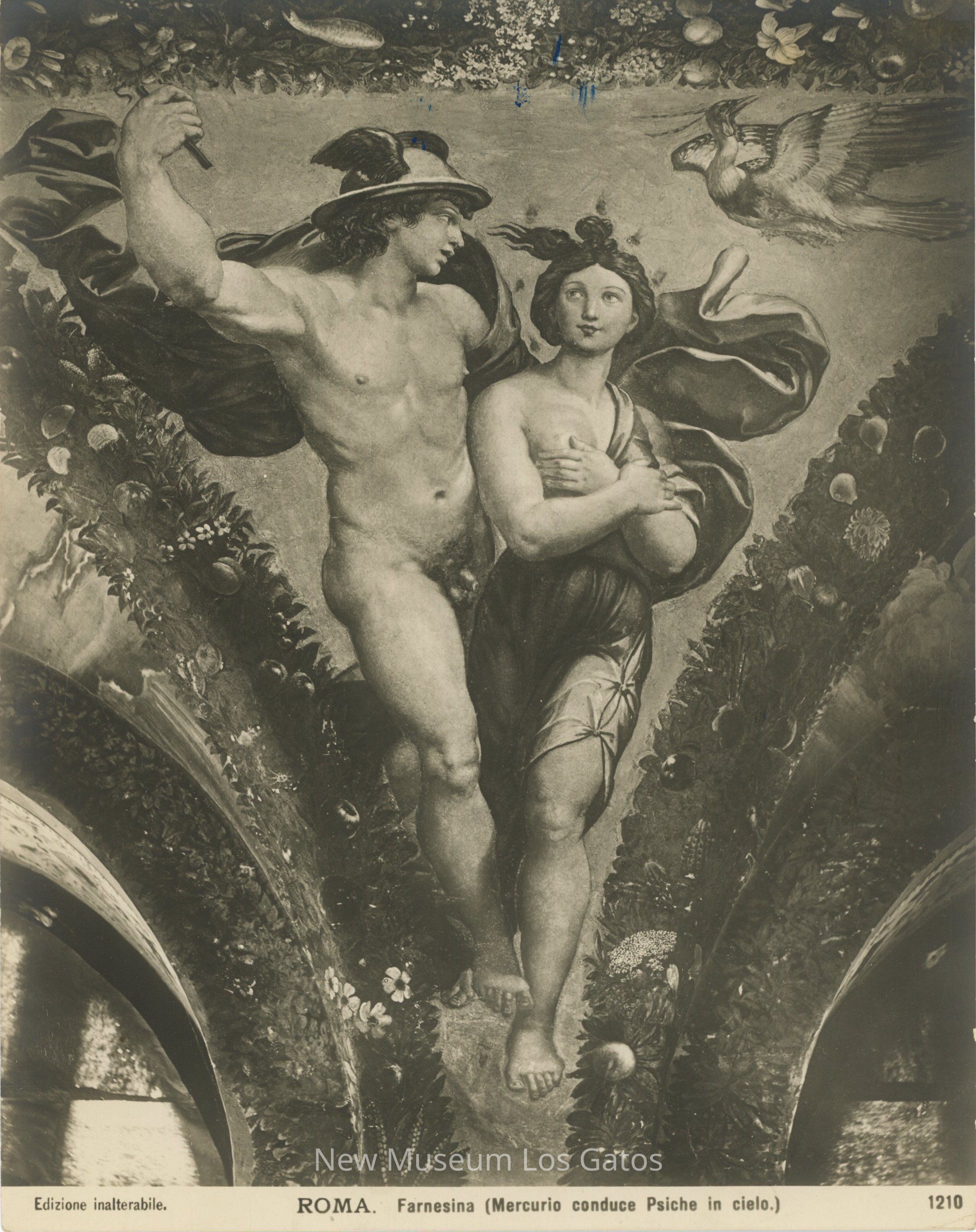 Black and white photograph of the painting "Mercury Brings Psyche up to Olympus" by Raphael. The painting is in the triangular form of the ceiling in the Villa Farnesia, in Rome. The painting depicts the god Mercury carrying Psyche up to the Mount Olympus. The image is flanked by images of greenery and fruits.Collection