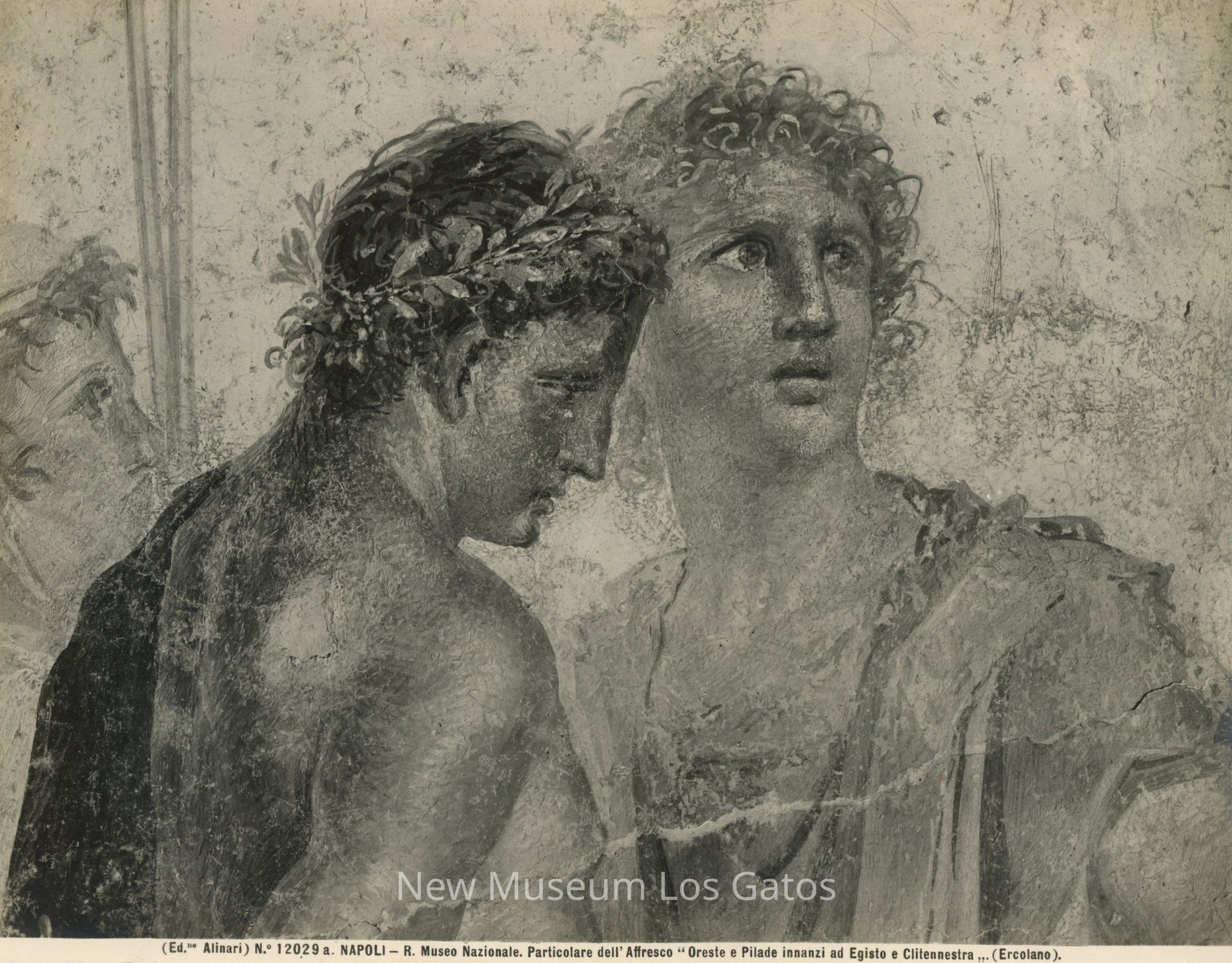 Black and white detail photograph of a fresco, "Orestes and Pylades," in Pompeii, Italy. Orestes and Pylades are standing close to each other, with the detail shot focusing on their busts. The fresco depicts a scene from "Iphigenia in Tauris," by Euripides.Collection