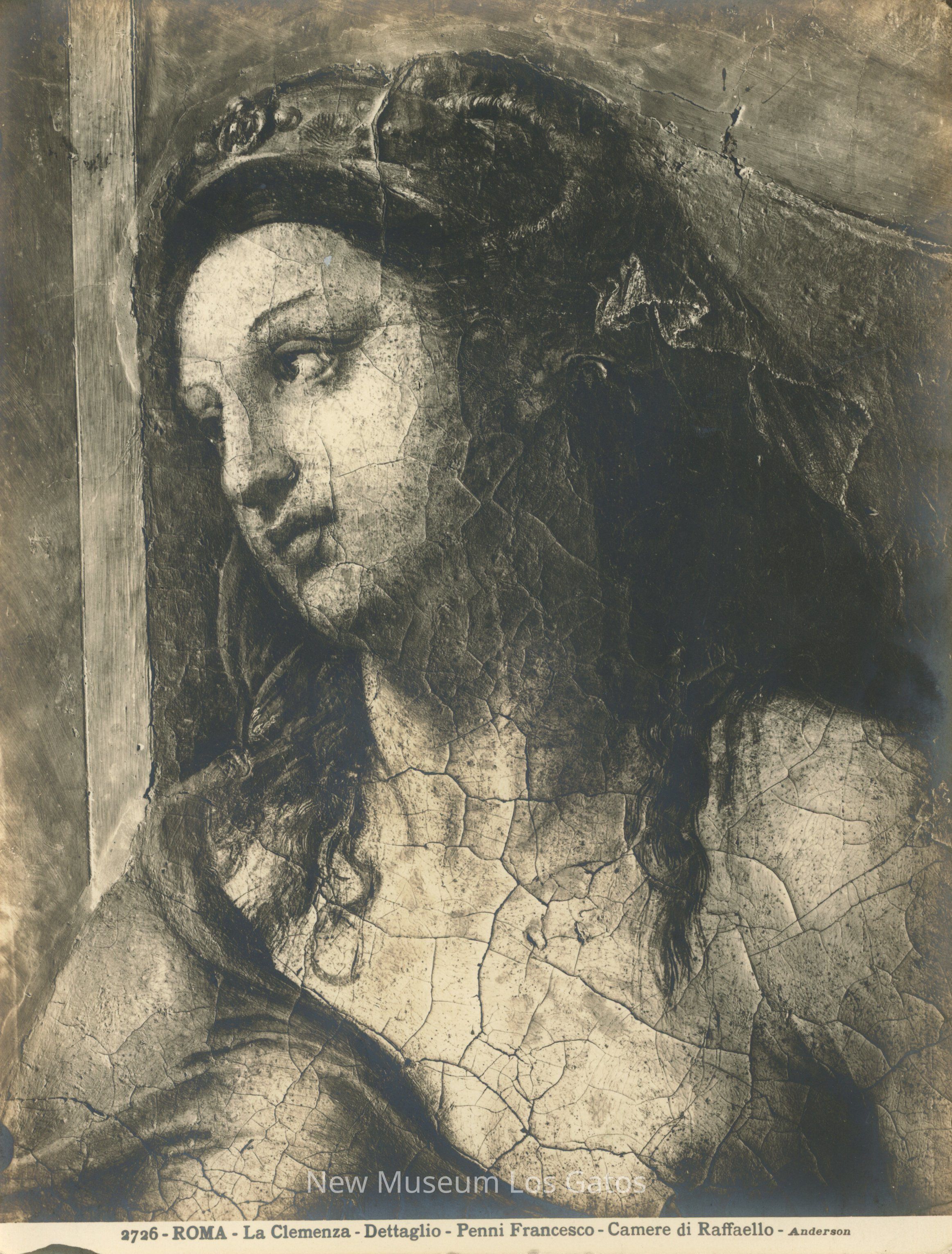 Black and white photograph of a detail shot of "Pope Clement I, between Moderation and Clemency." The detail shot depicts the personification of Clemency. The painting is by Giulio Romano.Collection