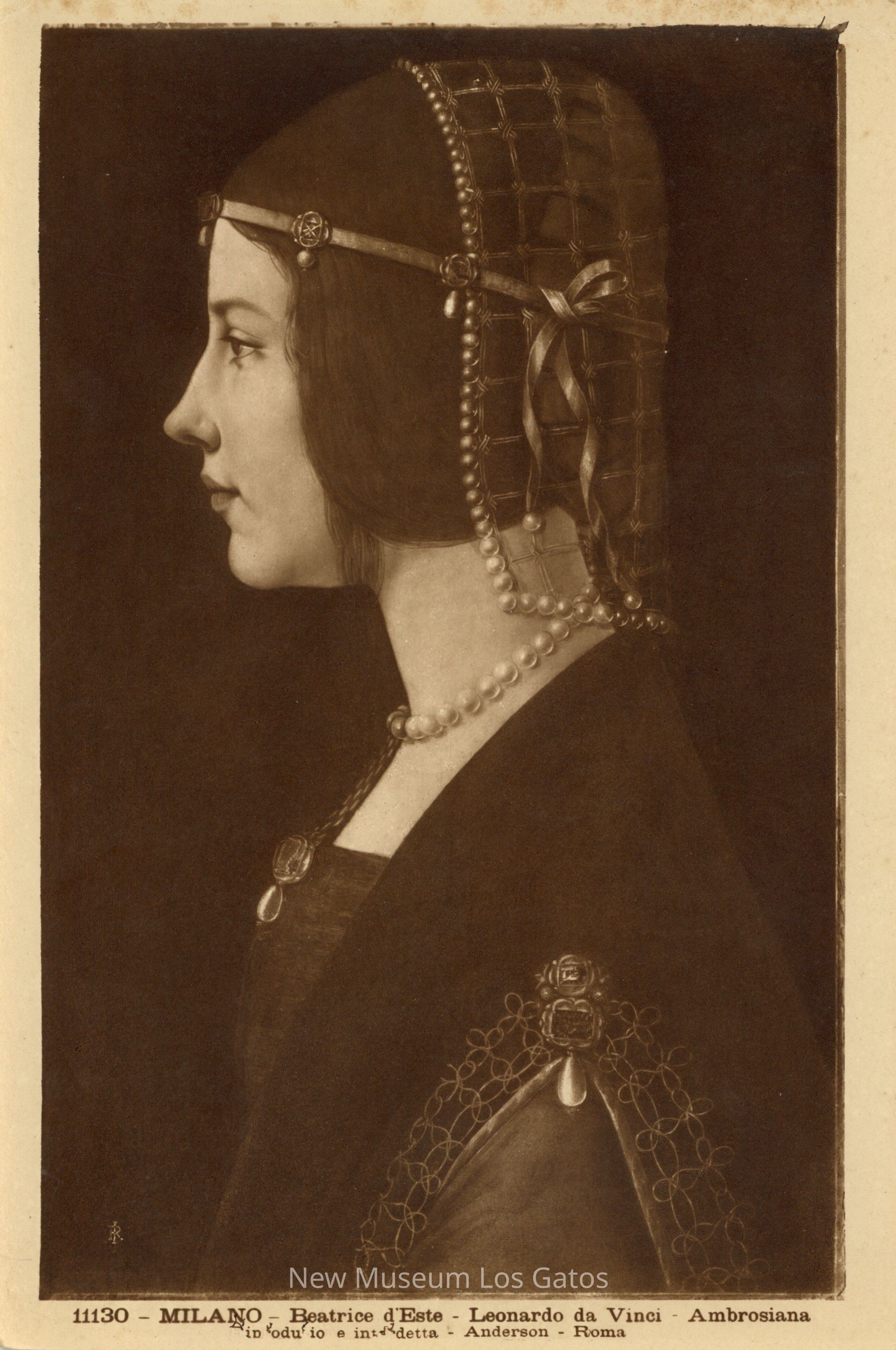 Sepia-toned photograph of the painting "Portrait of a Lady," often attributed to Leonardo da Vinci. The woman is looking to the left side of the page, and she is wearing a dress and pearl-adorned ribbon cap. She has long brown hair. The painting is labelled at the bottom edge.Collection