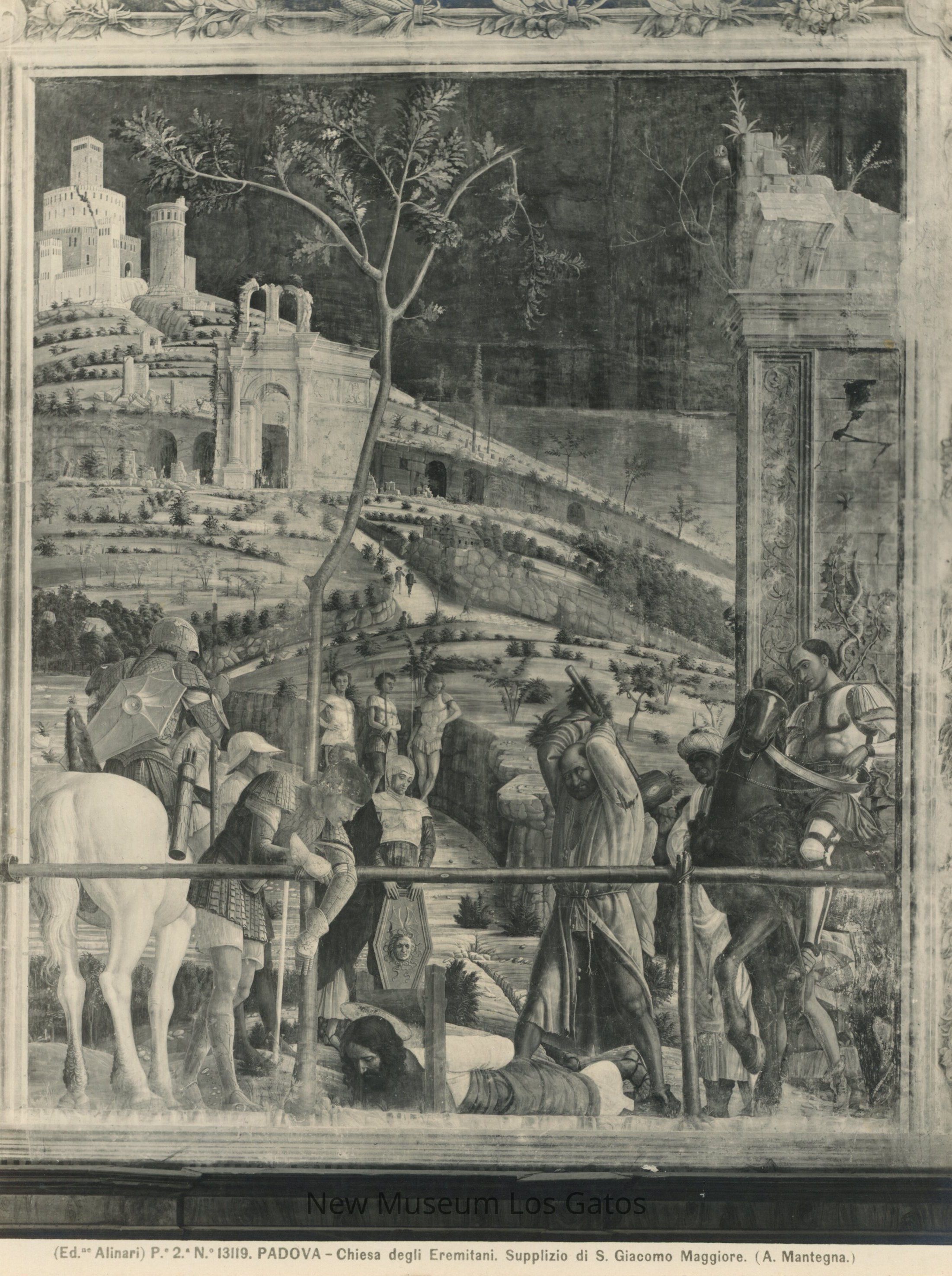Black and white photograph of the painting "Scenes from the Life of St. James," Scene 6 by Andrea Mantegna. The location of the chapel housing this painting was destroyed in 1944, and very little of the painting remains today. The painting depicts the martyrdom of St. James.Collection