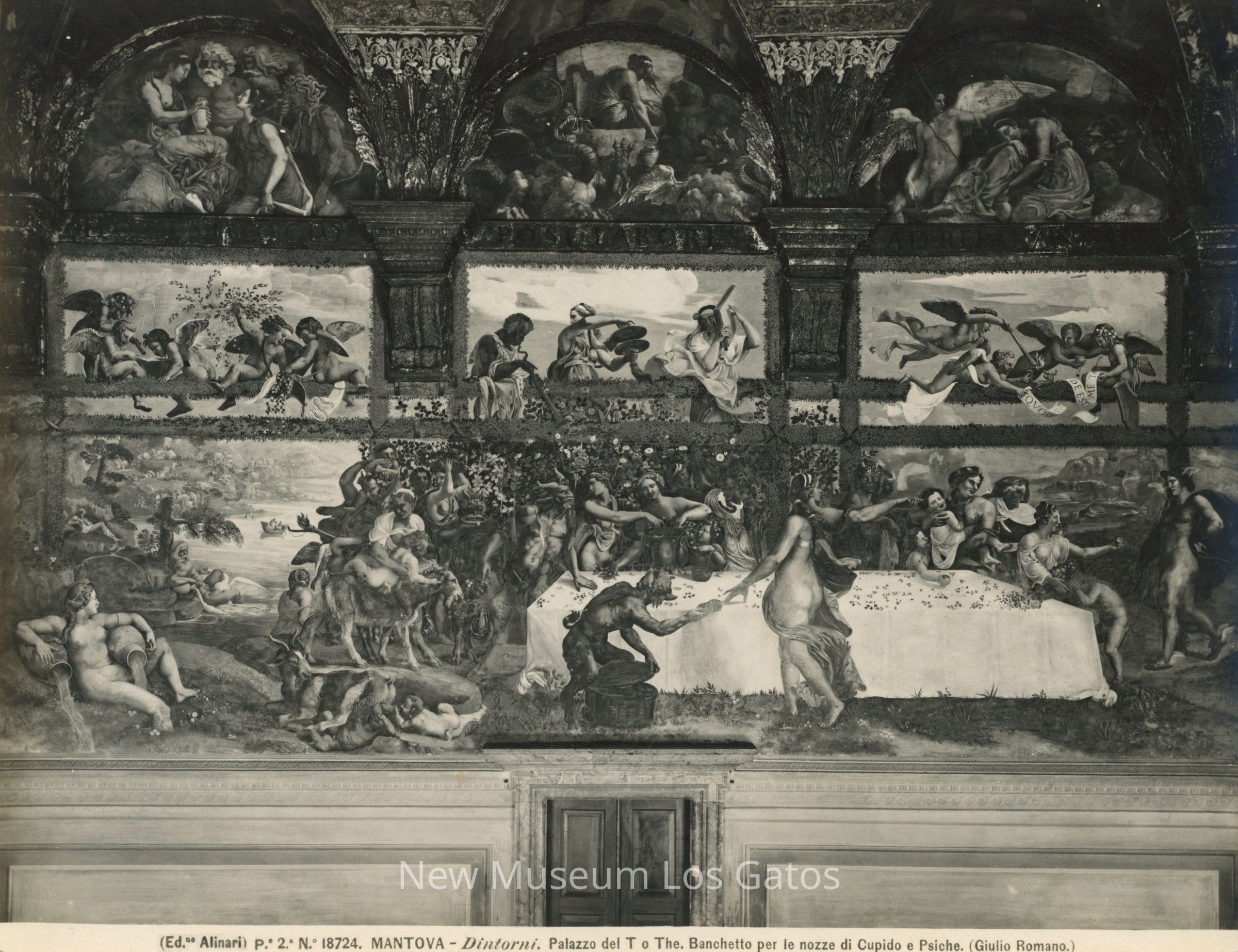 Black and white photograph of the fresco "The Marriage Banquet of Cupid and Psyche," by Giulio Romano. The fresco depicts the marriage of Cupid and Psyche.Collection