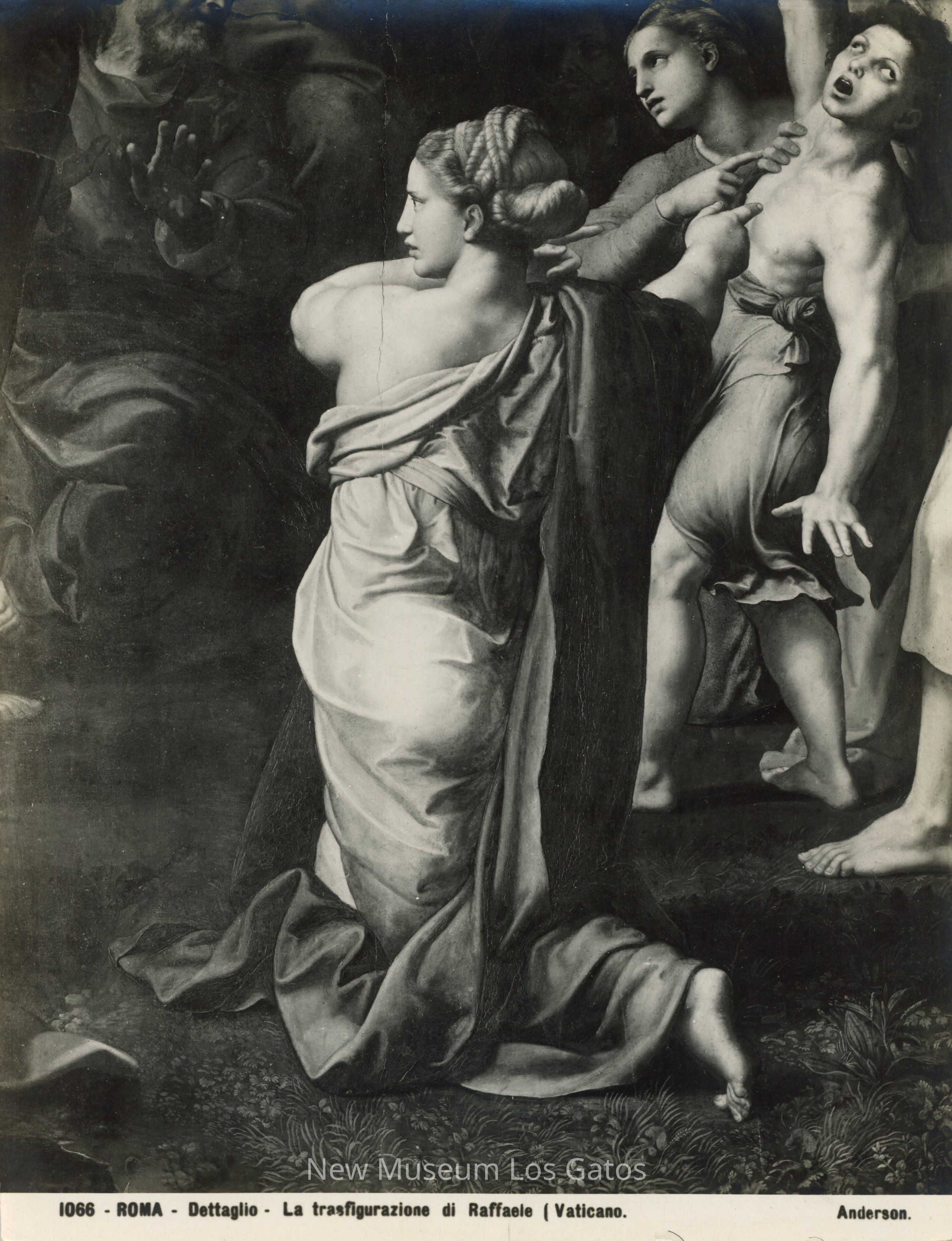 Black and white photograph of a detail shot of "The Transfiguration" by Raphael. The detail shot is of one of the disciples, pointing to the 'possessed youth' as described in the gospel of Matthew.Collection