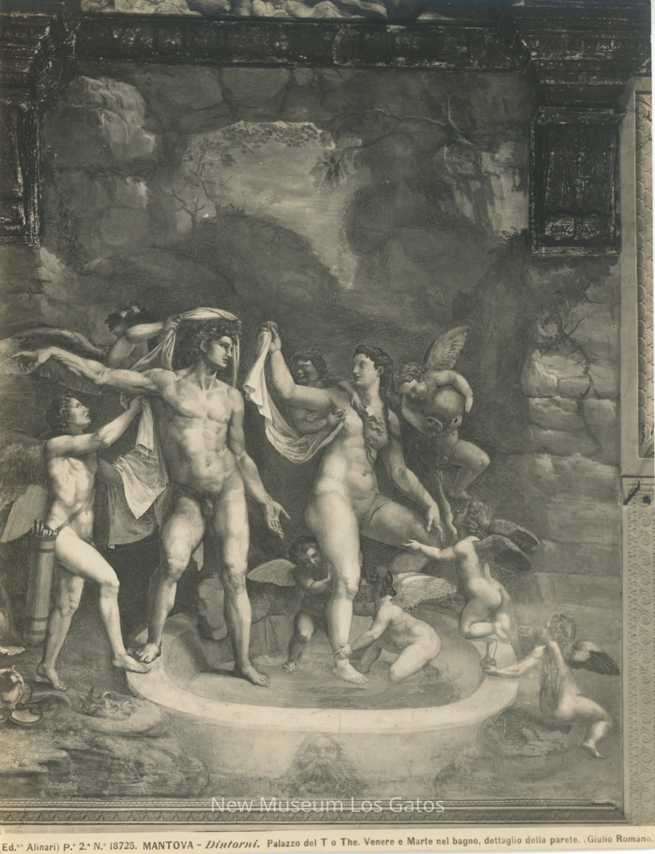 Black and white photograph of the fresco "Venus and Mars Bathing," by Giulio Romano. The fresco is painted onto a wall, surrounded by a wooden frame and corbel. The fresco depicts the Roman gods Venus and Mars bathing in a tub, surrounded by cherubs.Collection