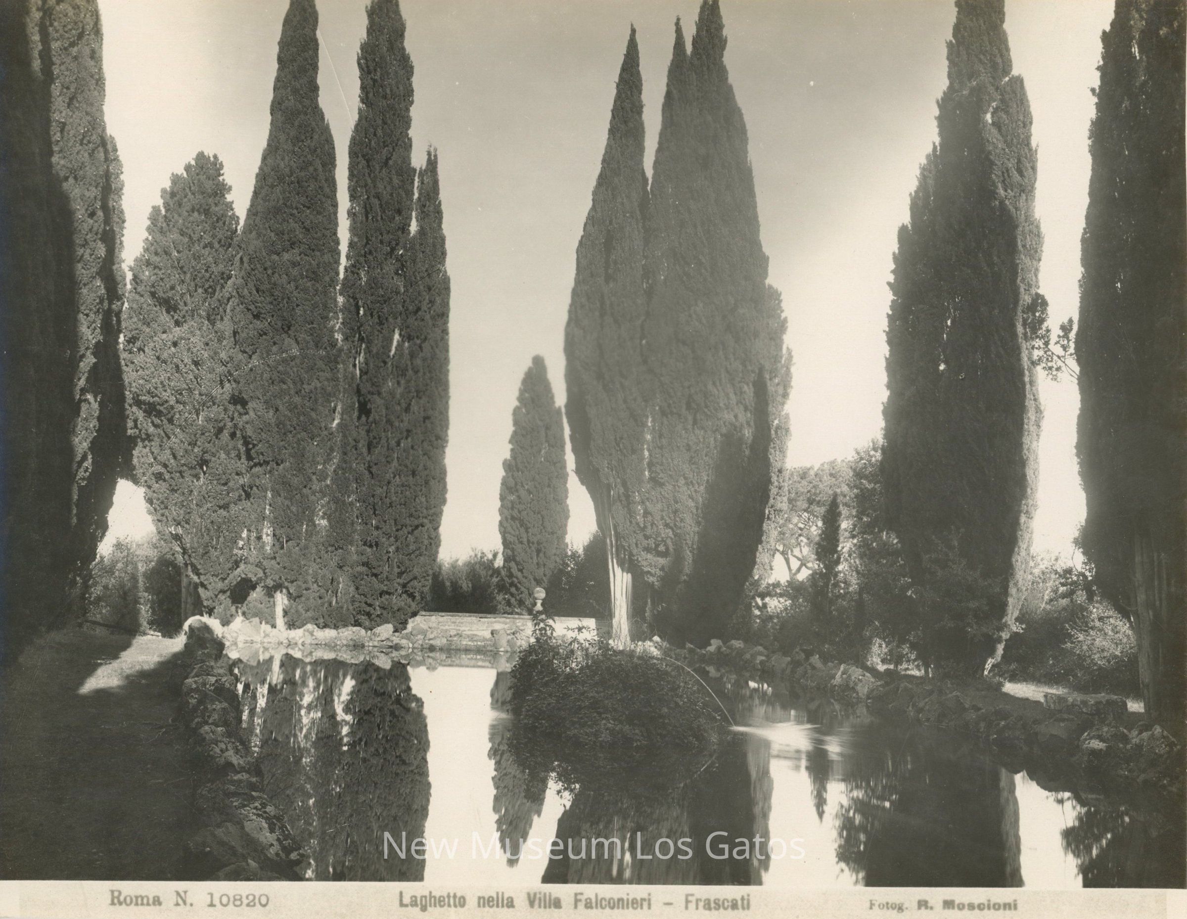 Black and white photograph of cypress trees, behind a long flat pond with a small fountain.