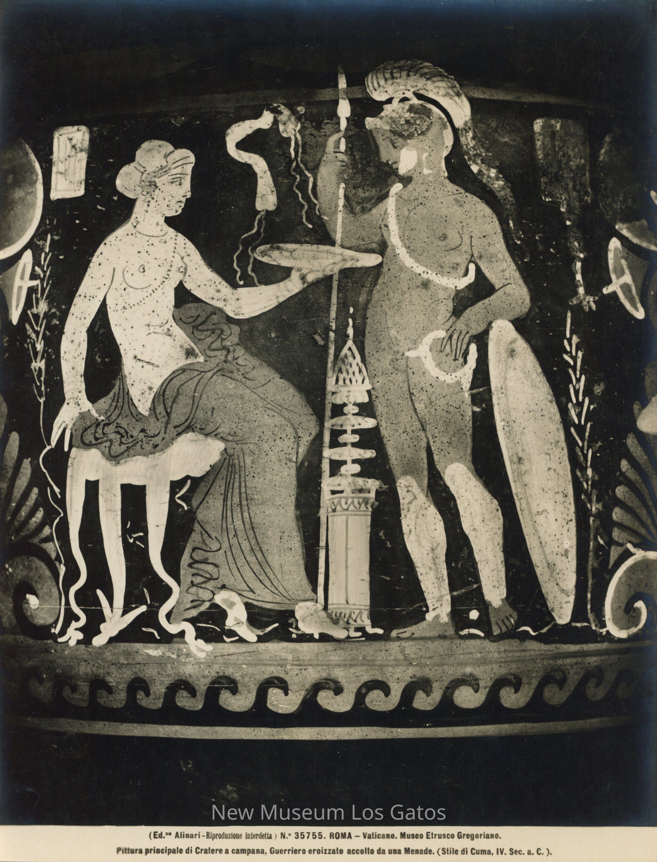 Black and white photograph of a red-figure vessel. The vessel has two figures, one man and one woman. The woman is seated, holding a plate out to the man. The man is wearing a helmet and holding a spear, with a shield at his side.