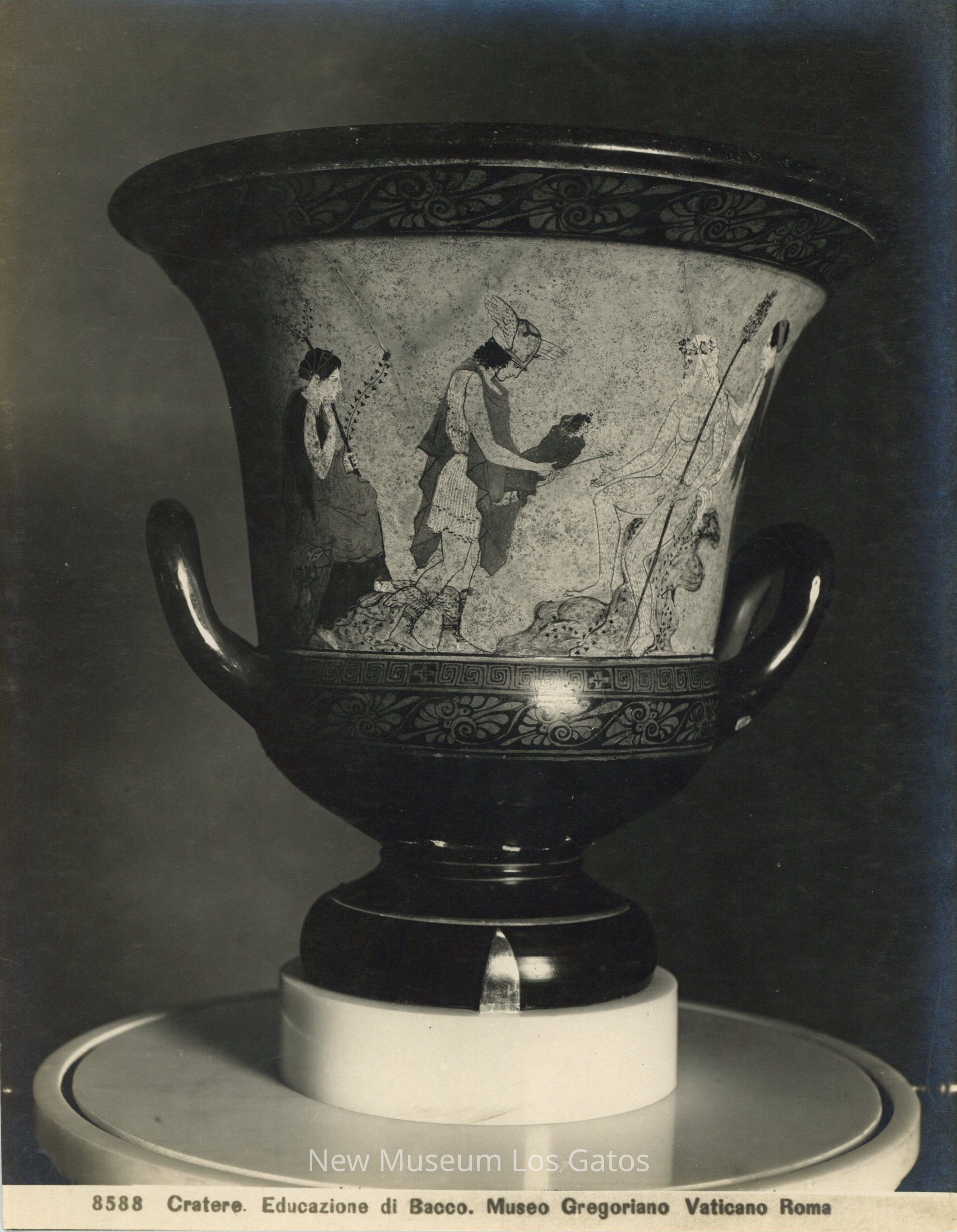 Black and white photograph of a red-figure vase, depicting Hermes carrying the baby Dionysus to a satyr seated on a rock. The vase is on a large marble pedestal.