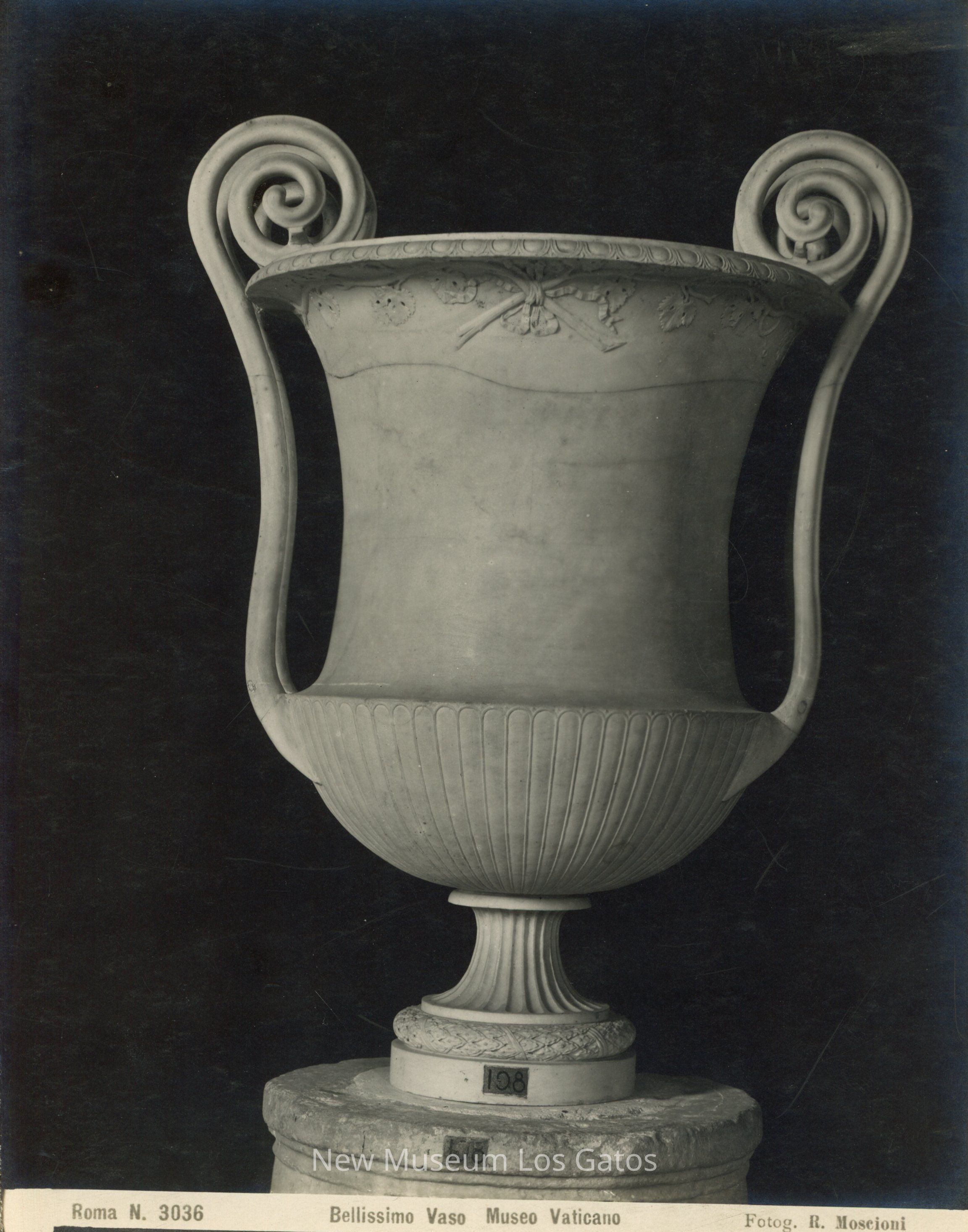 A black and white photograph of a large white vase, on a large marble pedestal. The vase and pedestal are labelled "108" on the base. The vase has four tall, spiraled handles on either side.