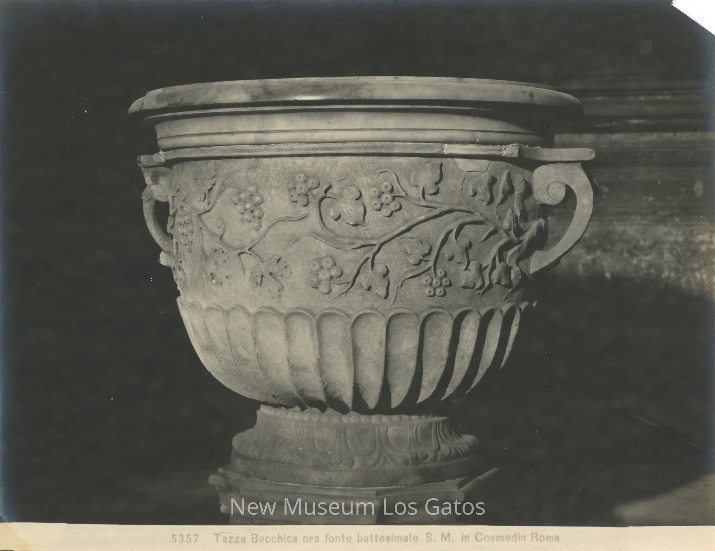Black and white photograph of a large stone or marble planter vessel. The vessel has reliefs of grapes and vines. The vessel is outside, in the grass.