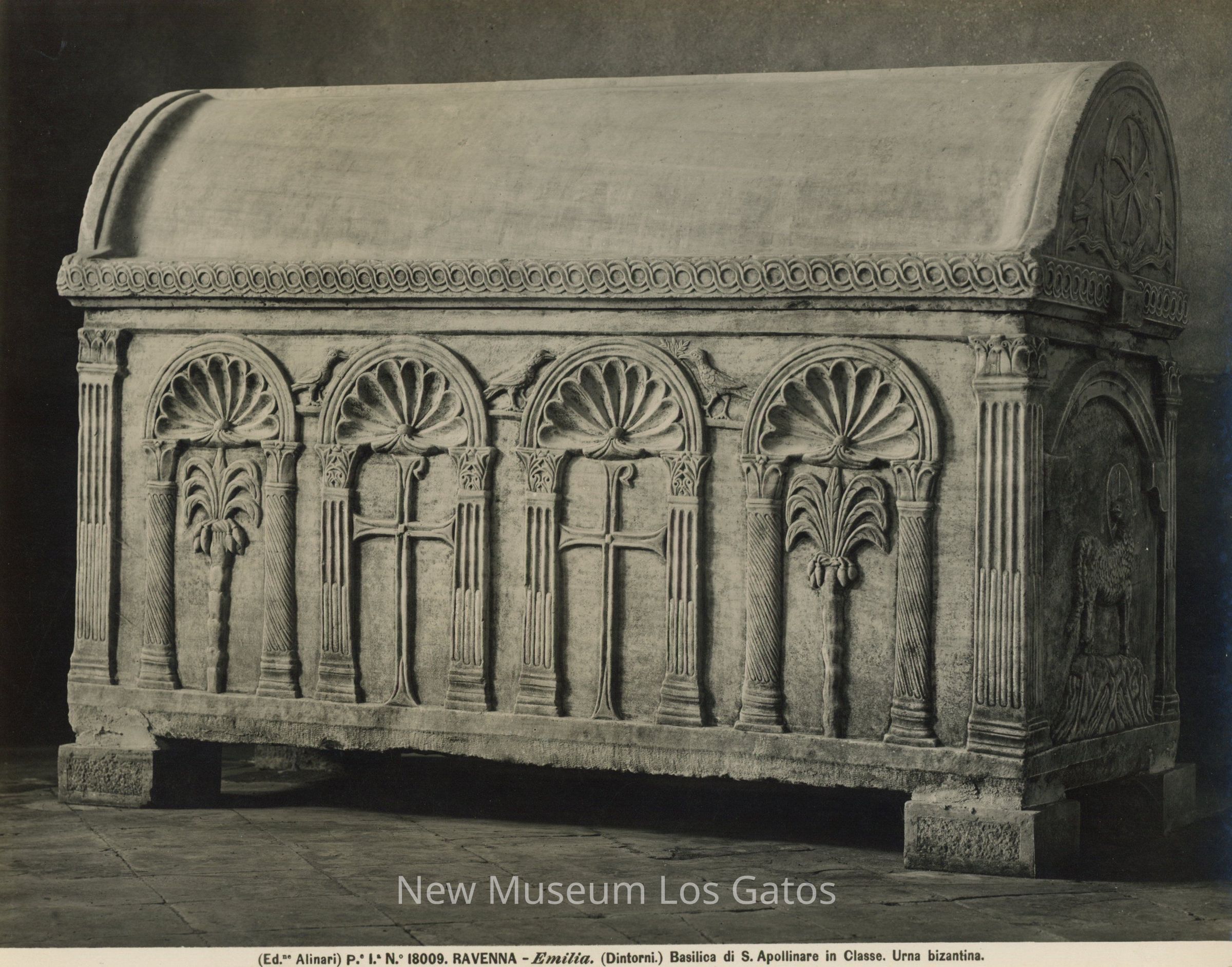 Black and white photograph of a stone sarcophagus. The sarcophagus has four decorative arches, with crosses and plant fronds on the long side. The sarcophagus has a curved lid, and four feet.
