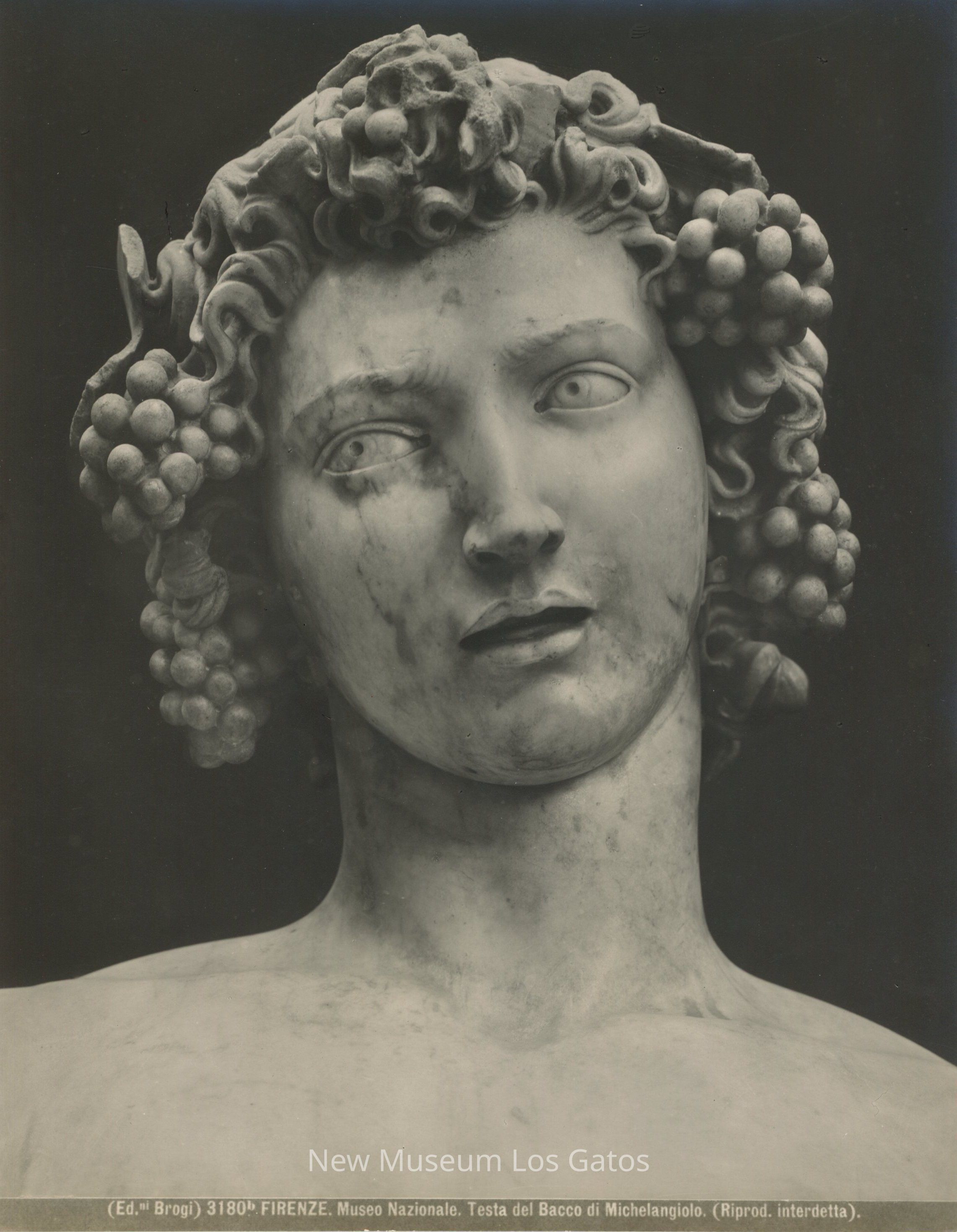 A black and white photograph of the statue "Bacchus," by Michelangelo. The statue is over-life-sized, depicting the Roman god of wine, Bacchus. The figure's face is surrounded by grapes. The statue is held in the Museo Nazionale del Bargello, Florence.Collection