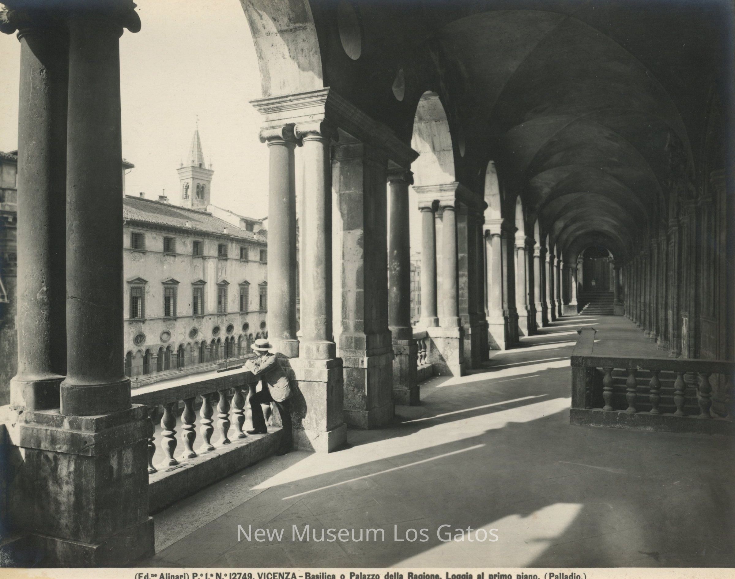 Black and white photograph of the Palladian Basilica in Vicenza, Italy, featuring large stone columns, arches, and corridor. There is a man in a straw hat at the left side, looking out over the balcony. There is a second building in the background, with a steeple. There is a staircase at the right, going down.Collection