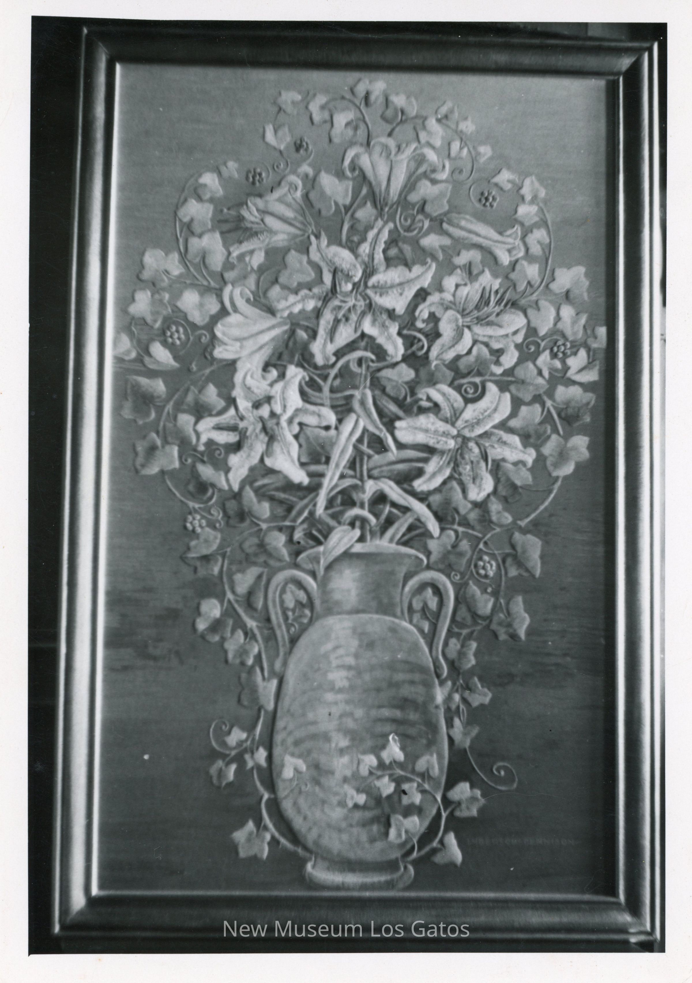 A black and white photograph of the painting Untitled (Lilies and Ivy) by Frank Ingerson and George Dennison. The painting is in a frame, centered in the photograph. The photograph is glossy.Collection