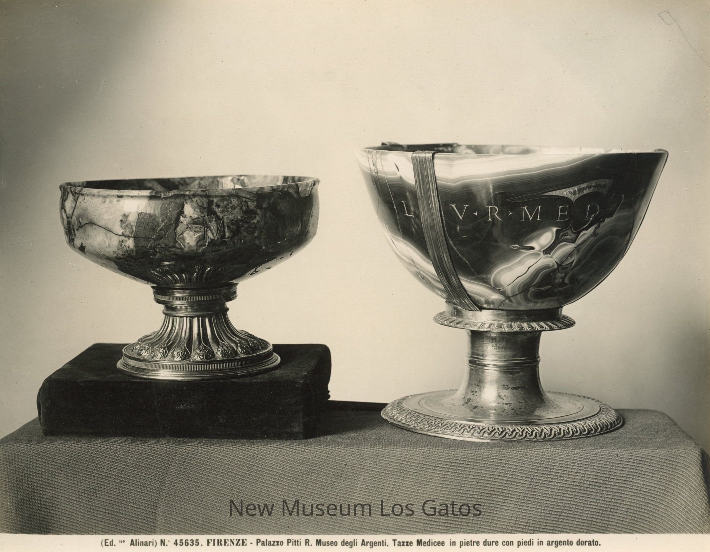 Black and white photograph of two stone vessels, with colored marbling and metal bases. The vessels are a part of the The Treasury of the Grand Dukes, in the Palazzo Pitti in Italy. One vessel is smaller, on a black velvet base. The larger has letters carved into the cup.Collection
