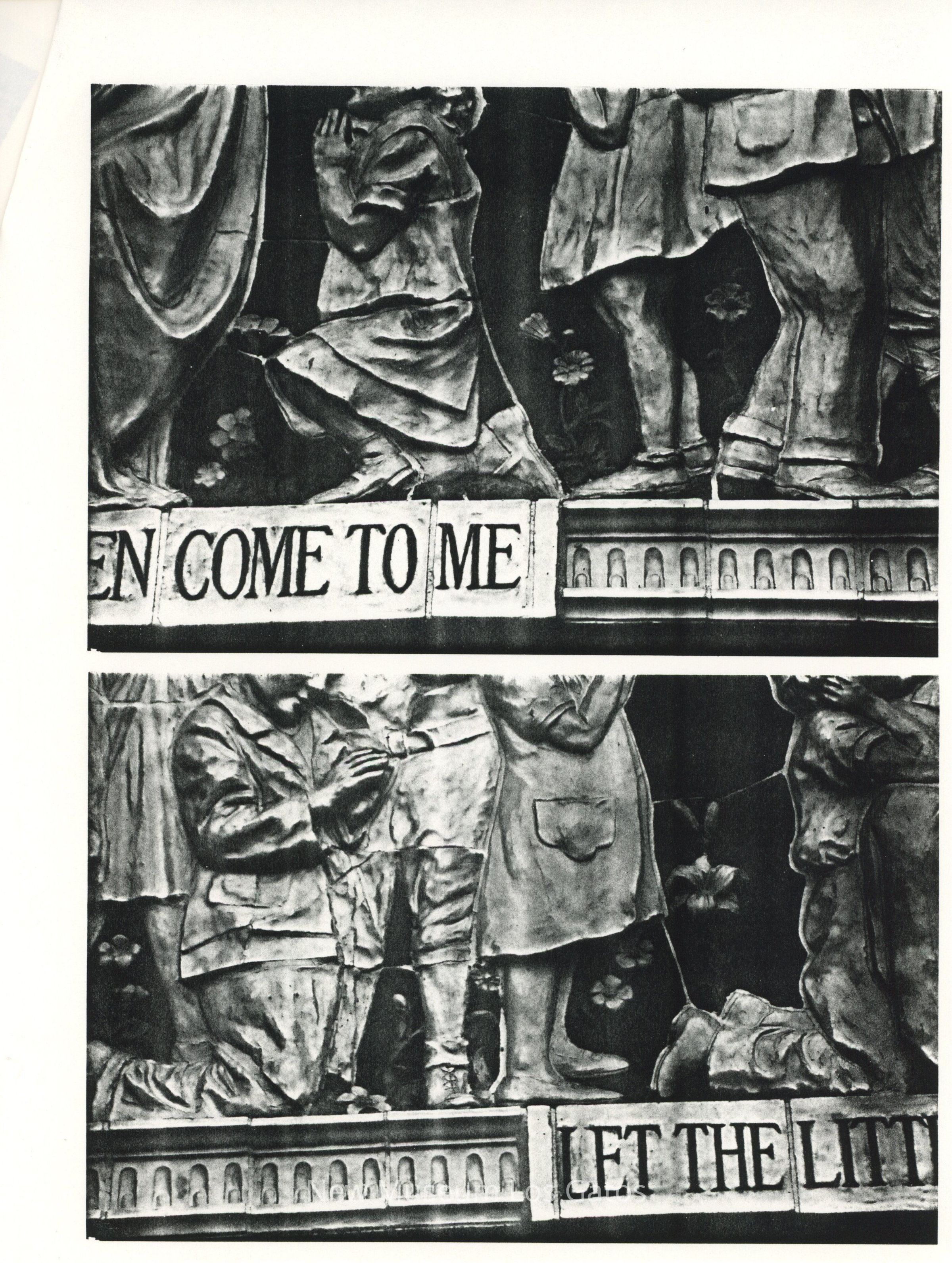 Three stapled photocopies of black and white photographs of tile work and sculpture by artist Father Luigi Sciocchetti at an unknown church in San Francisco. There are handwritten notes on the first page.Collection