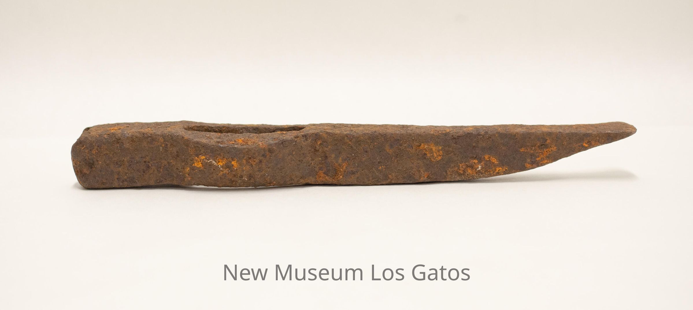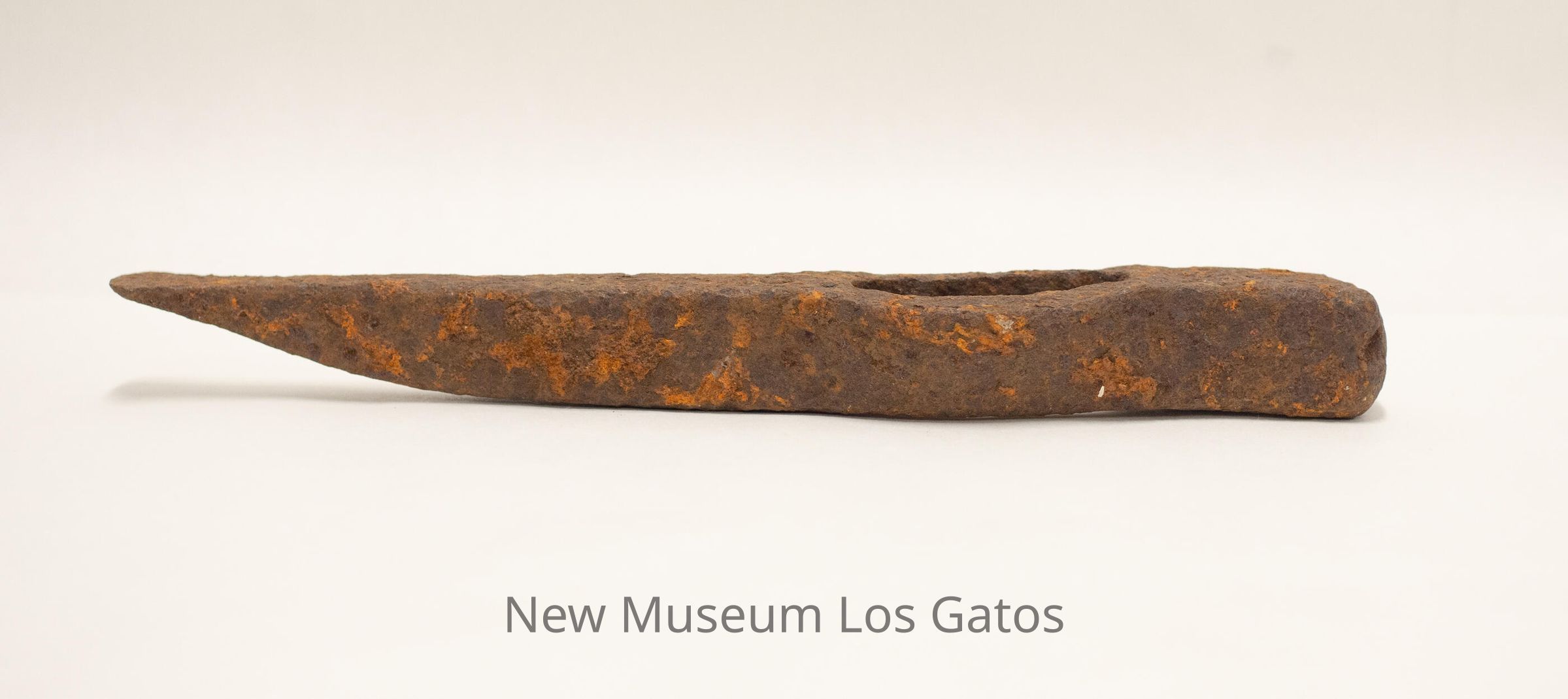 The metal portion of a pickaxe, with the wooden handle missing. From a top view, the head is rectangular at the top, bumps out into a circle in the middle with an oval hole for the handle, and narrows to a point at the bottom.Collection