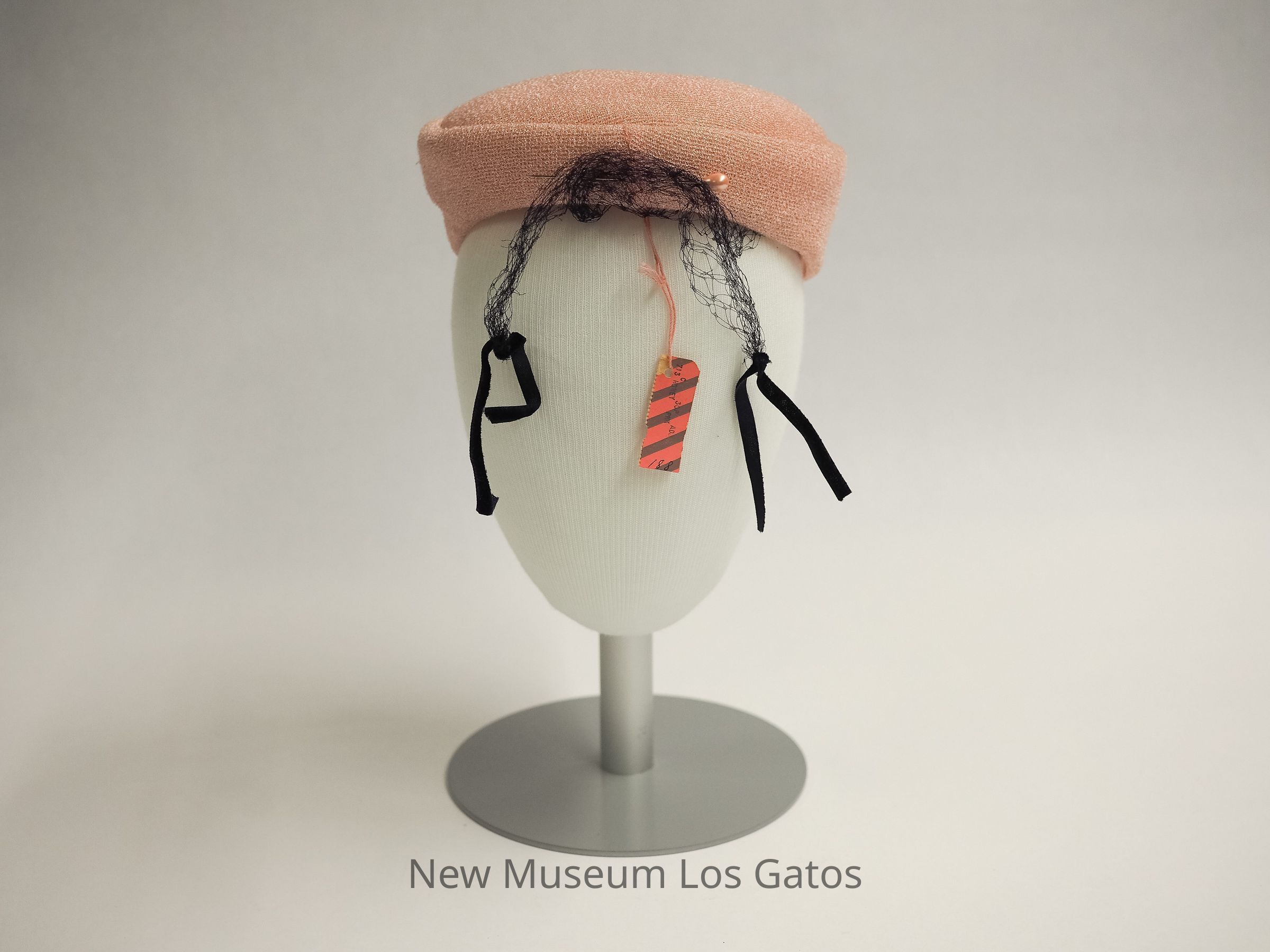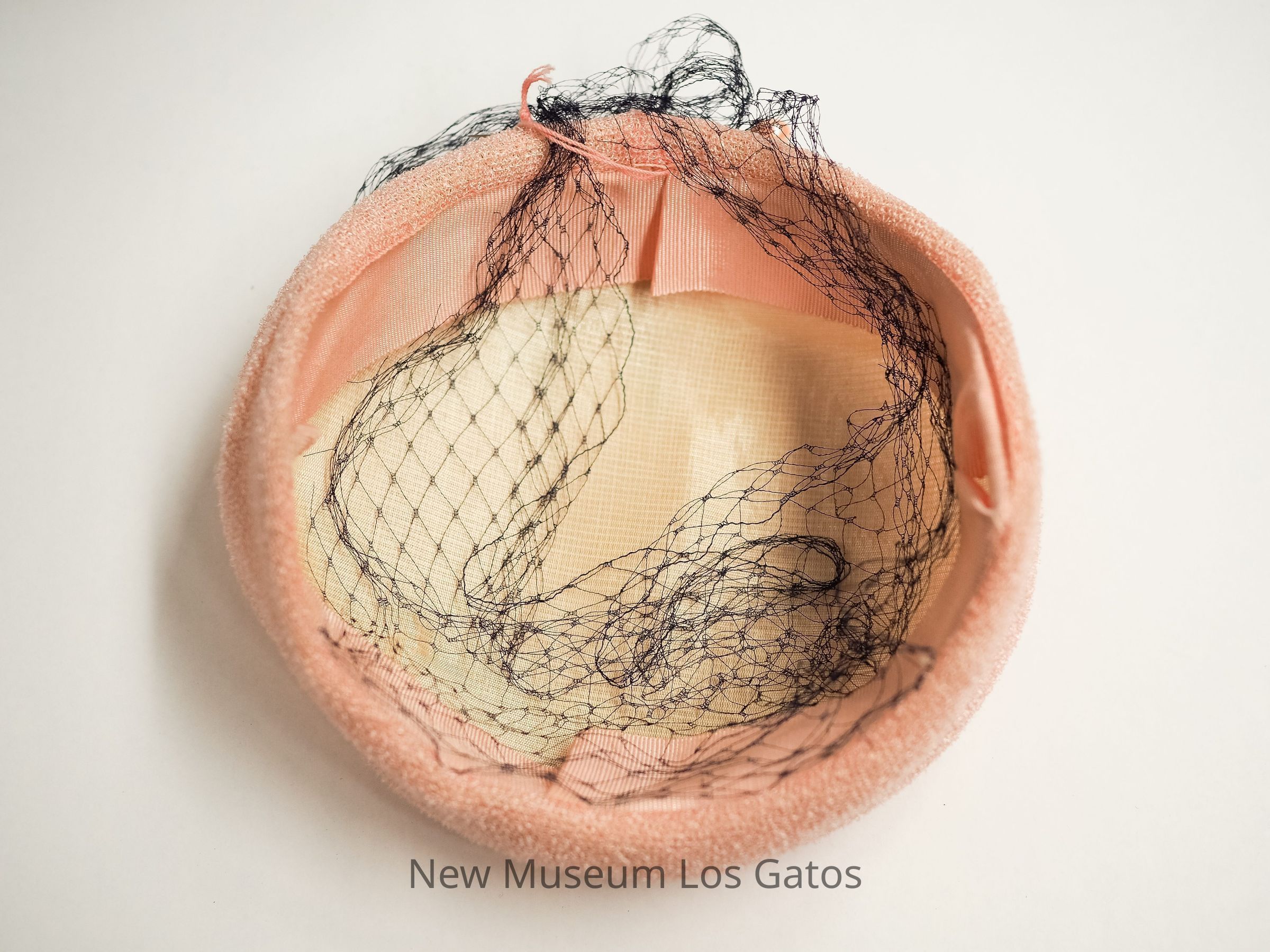 A small pink nylon pillbox hat with navy netting and ribbons and pink hatpin.
