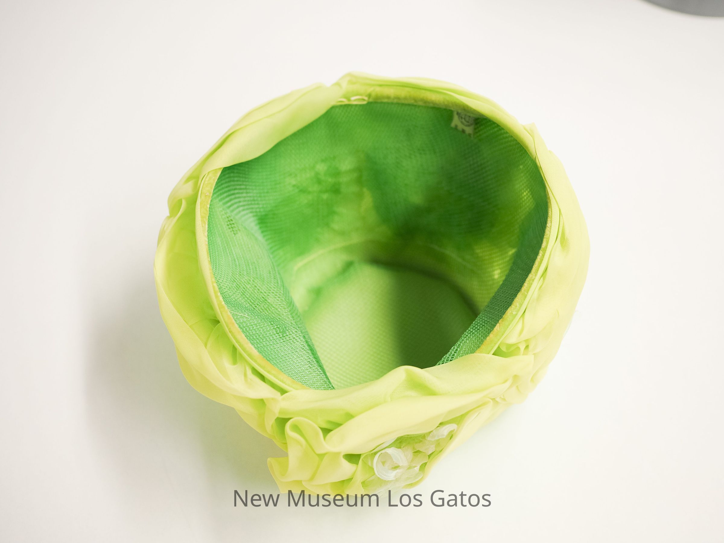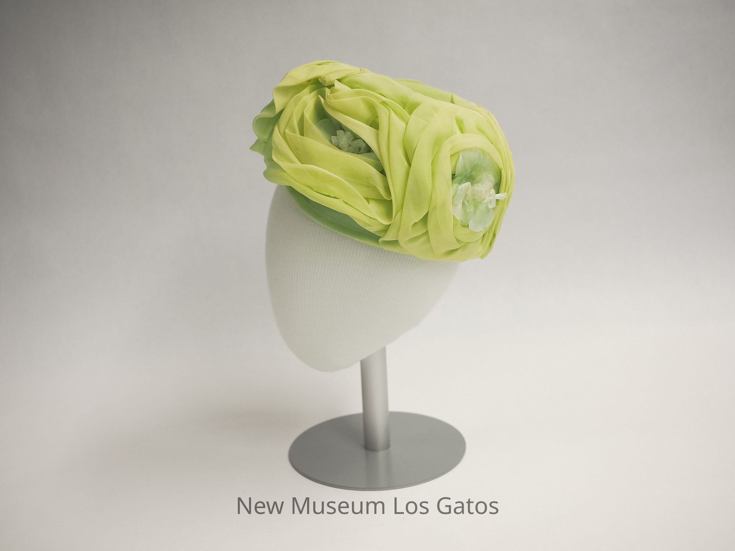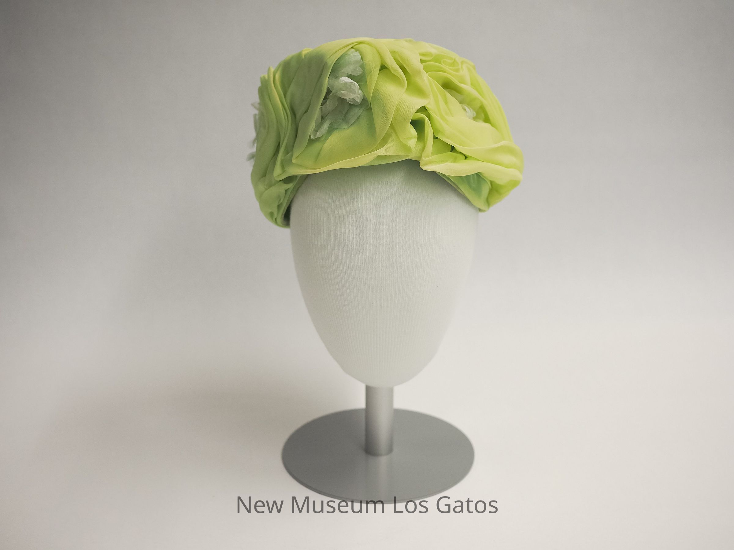 A light green nylon pillbox hat, with circular fabric decorations and white accents.
