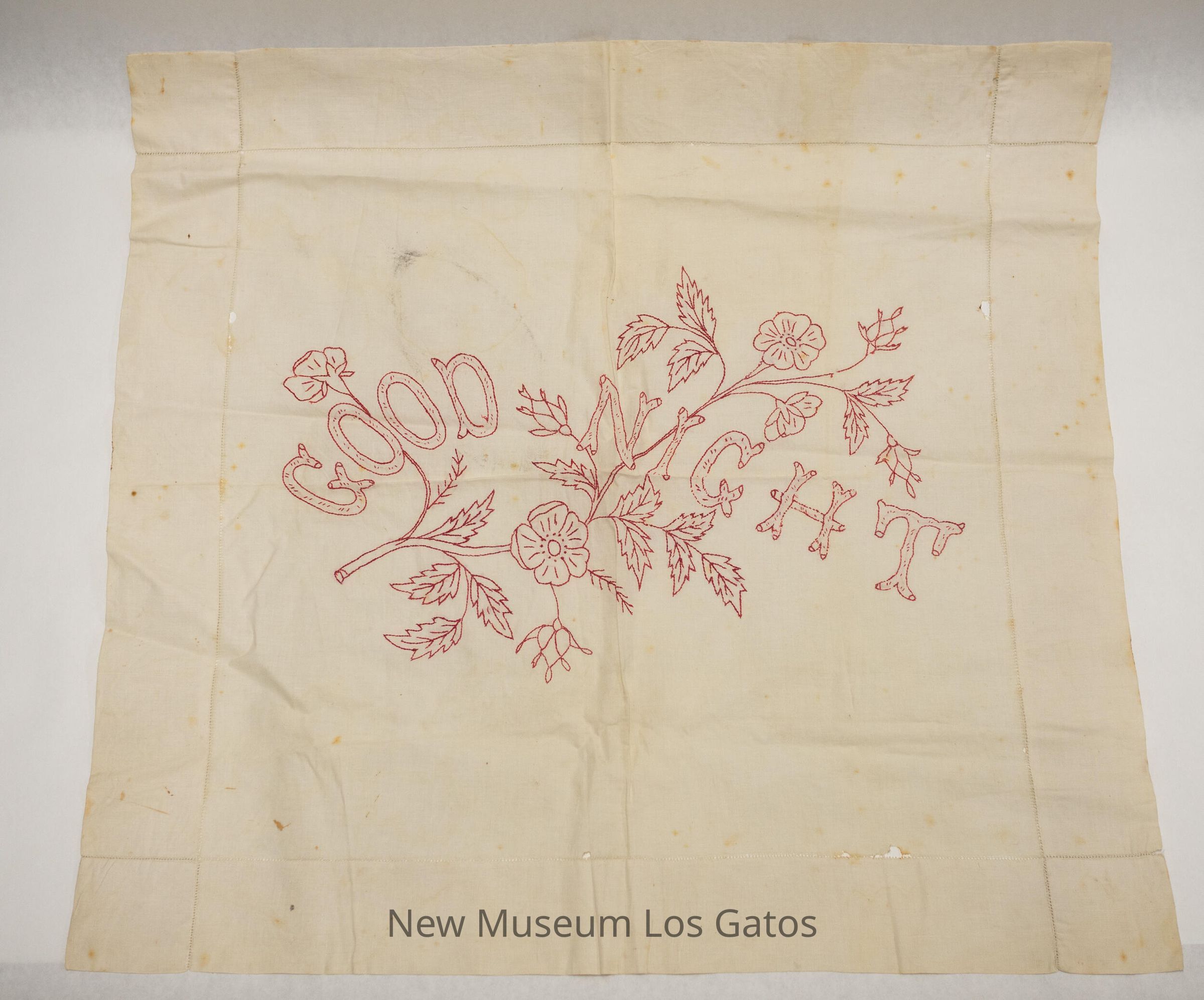 White pillow sham with red embroidered flowers and the words "Good Night" in the center.
