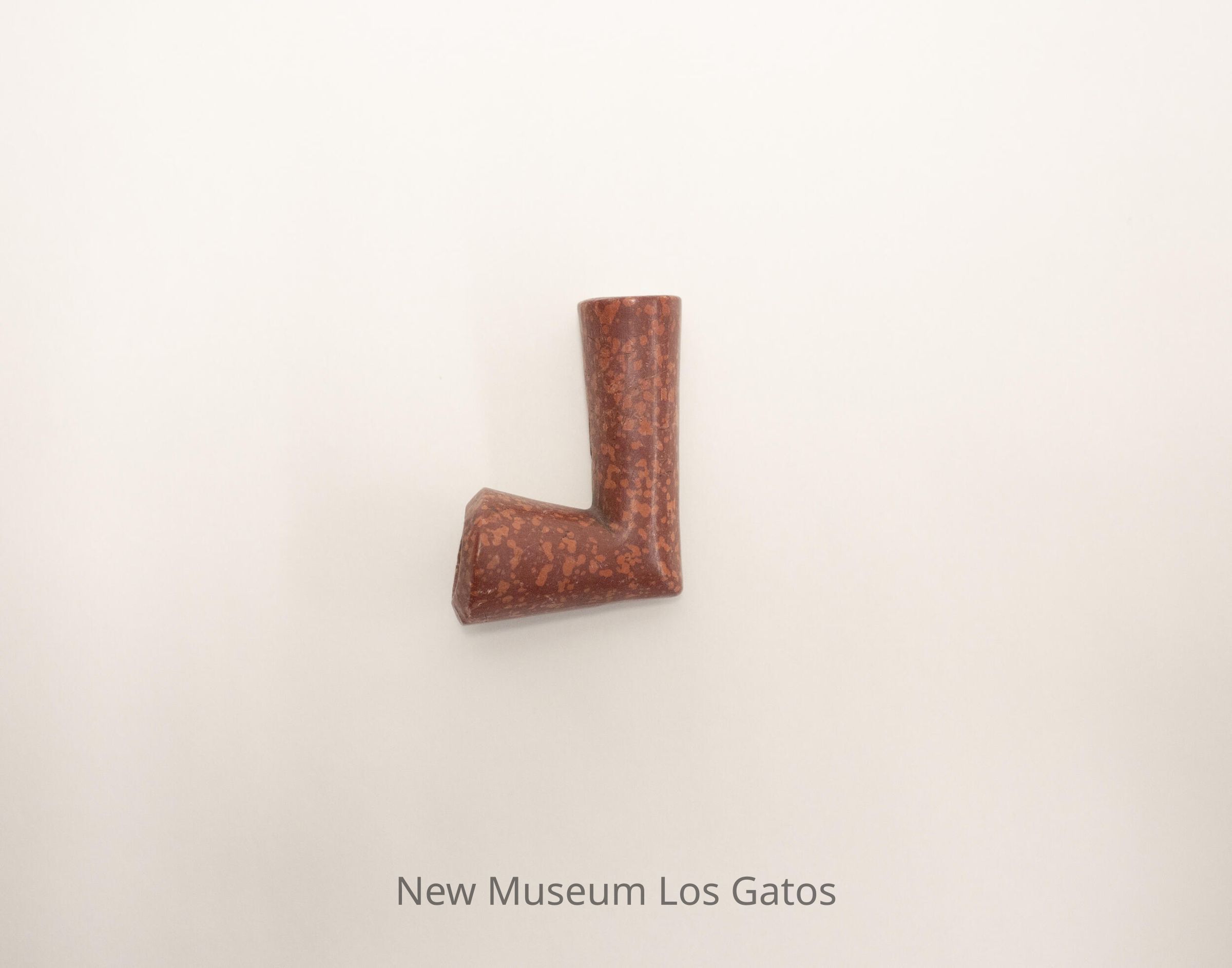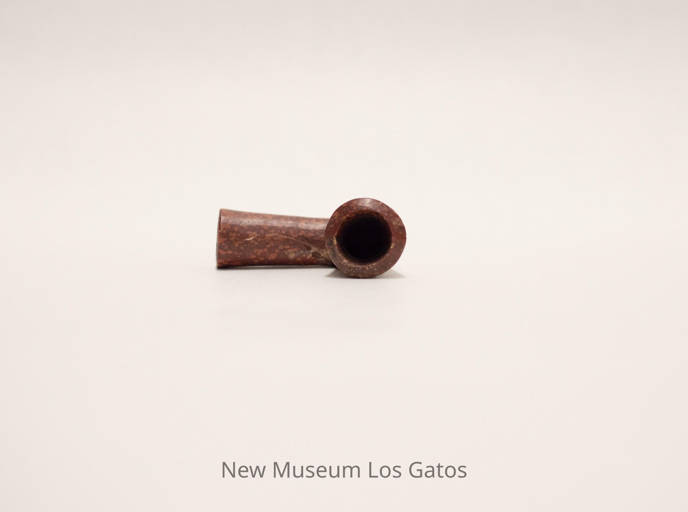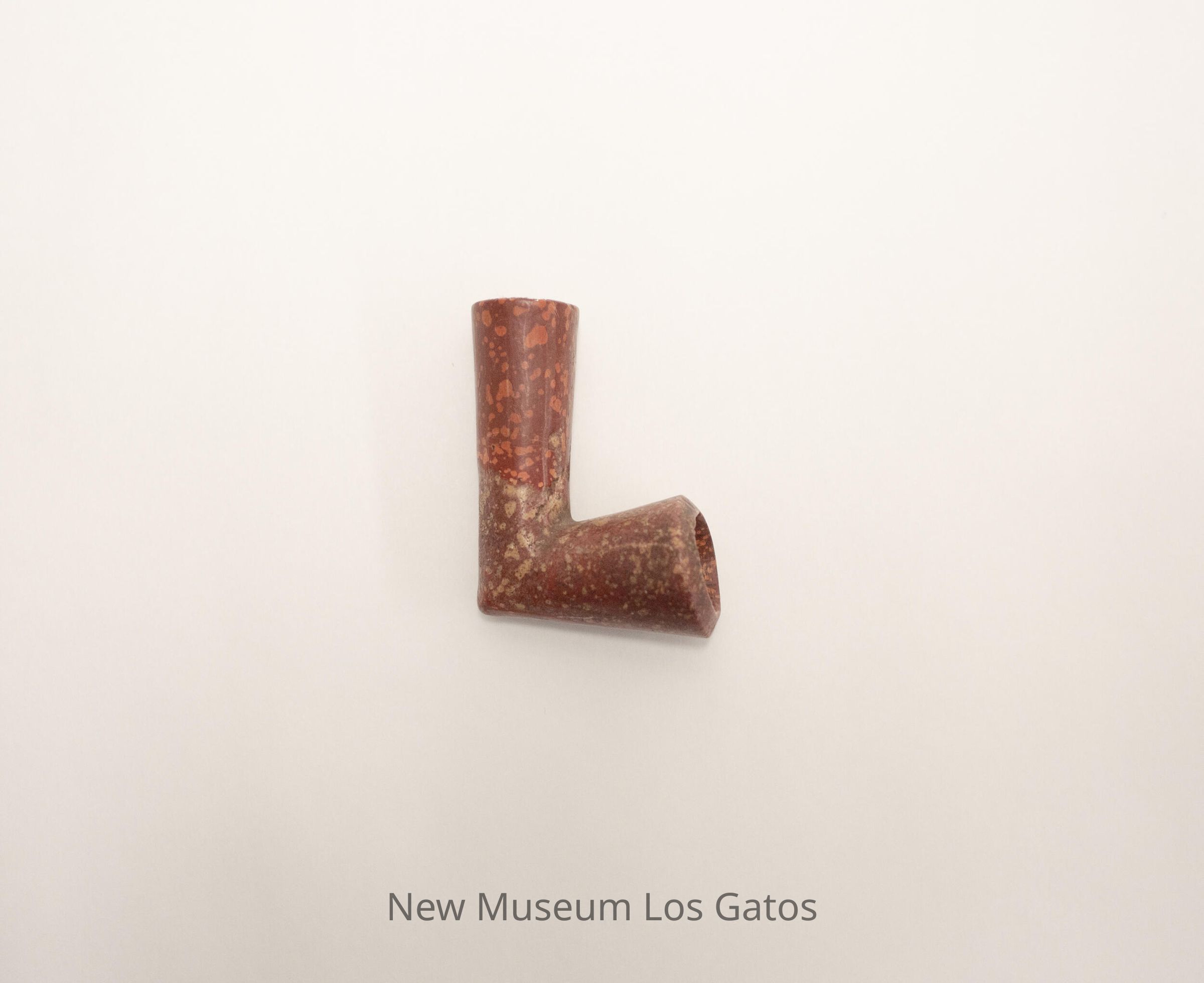 Small, red ceramic/stone part of a pipe. Part is at a 90 degree angle, and is speckled lighter red throughout. There appears to be a dry leaf inside the top portion.