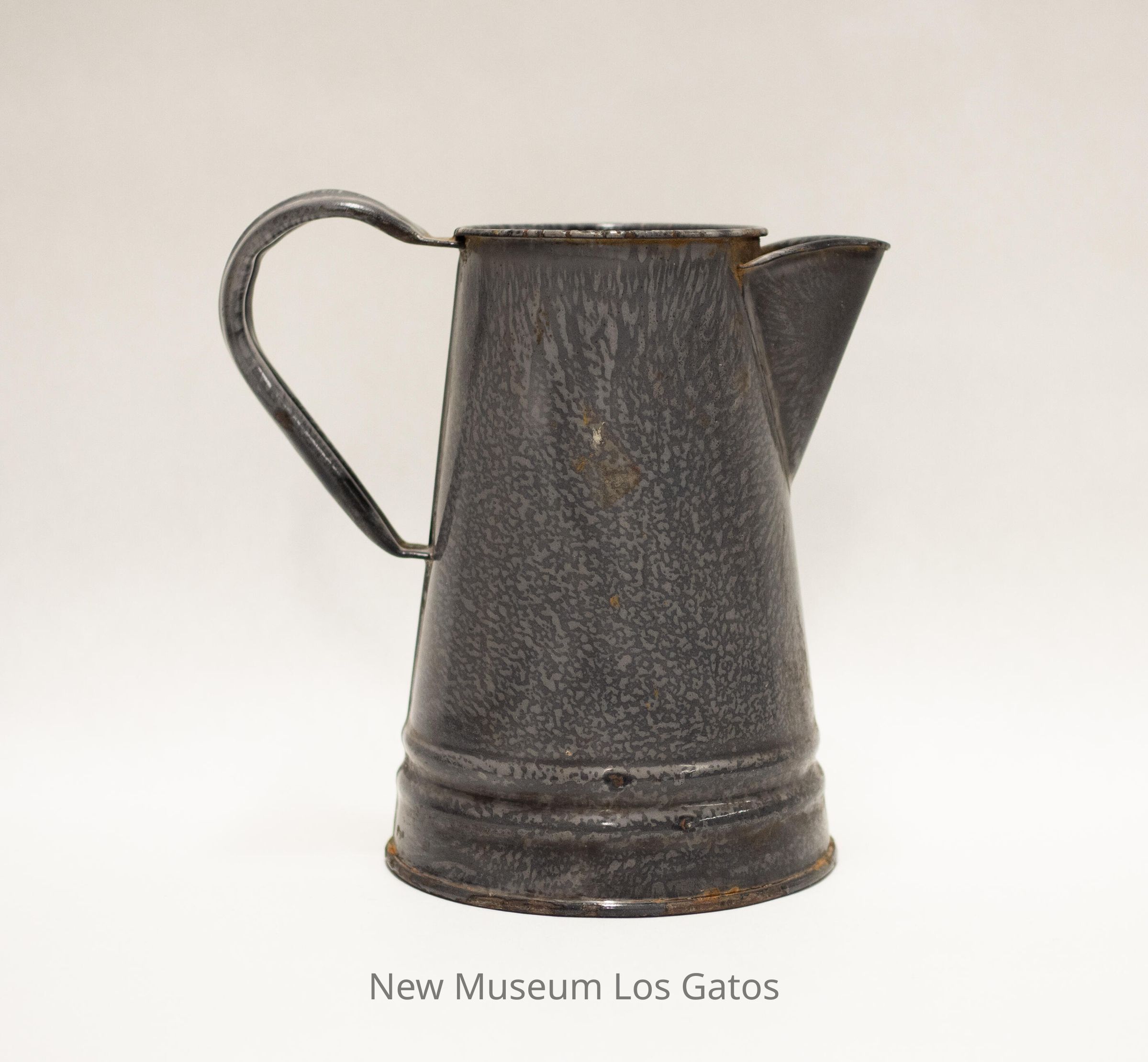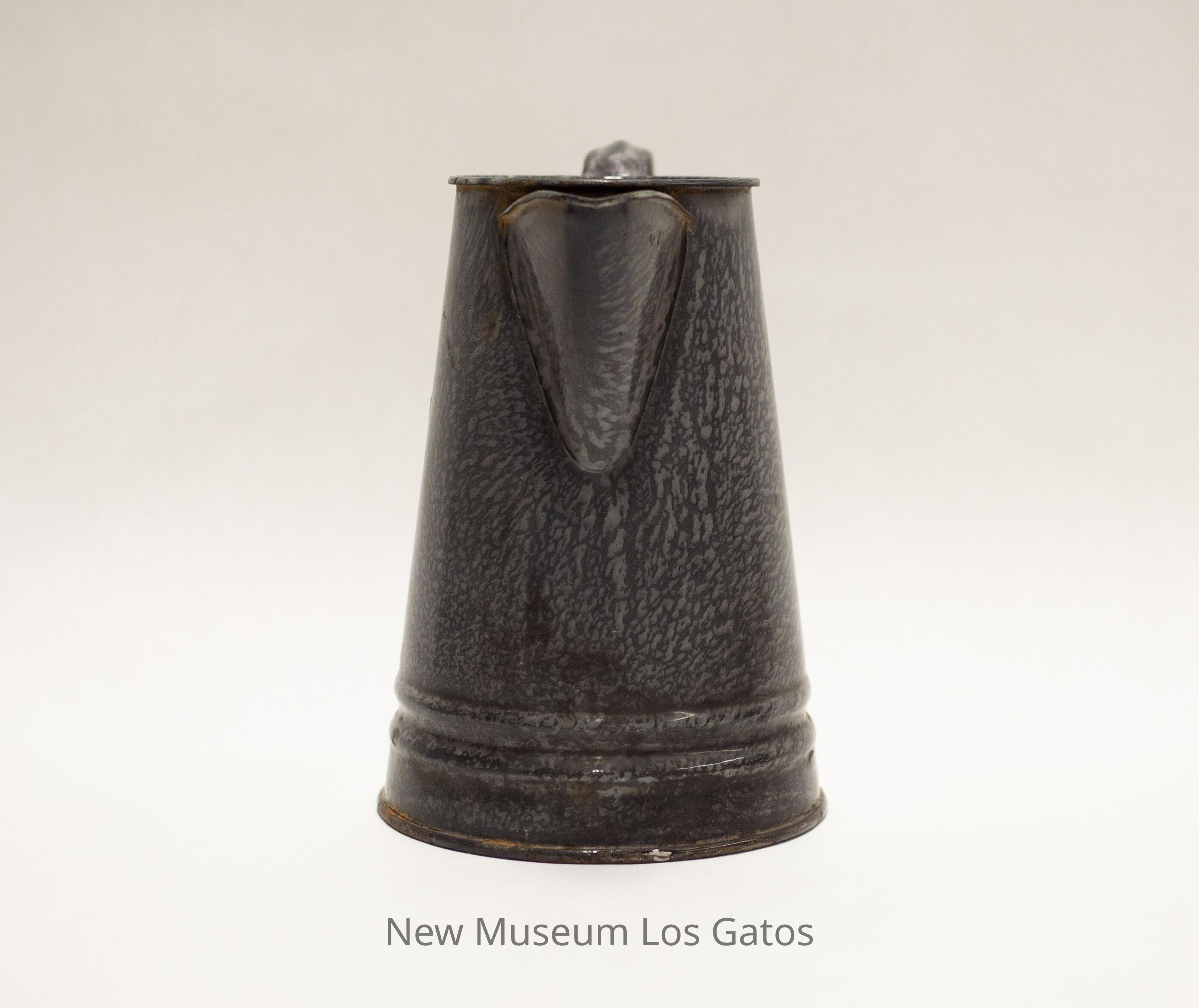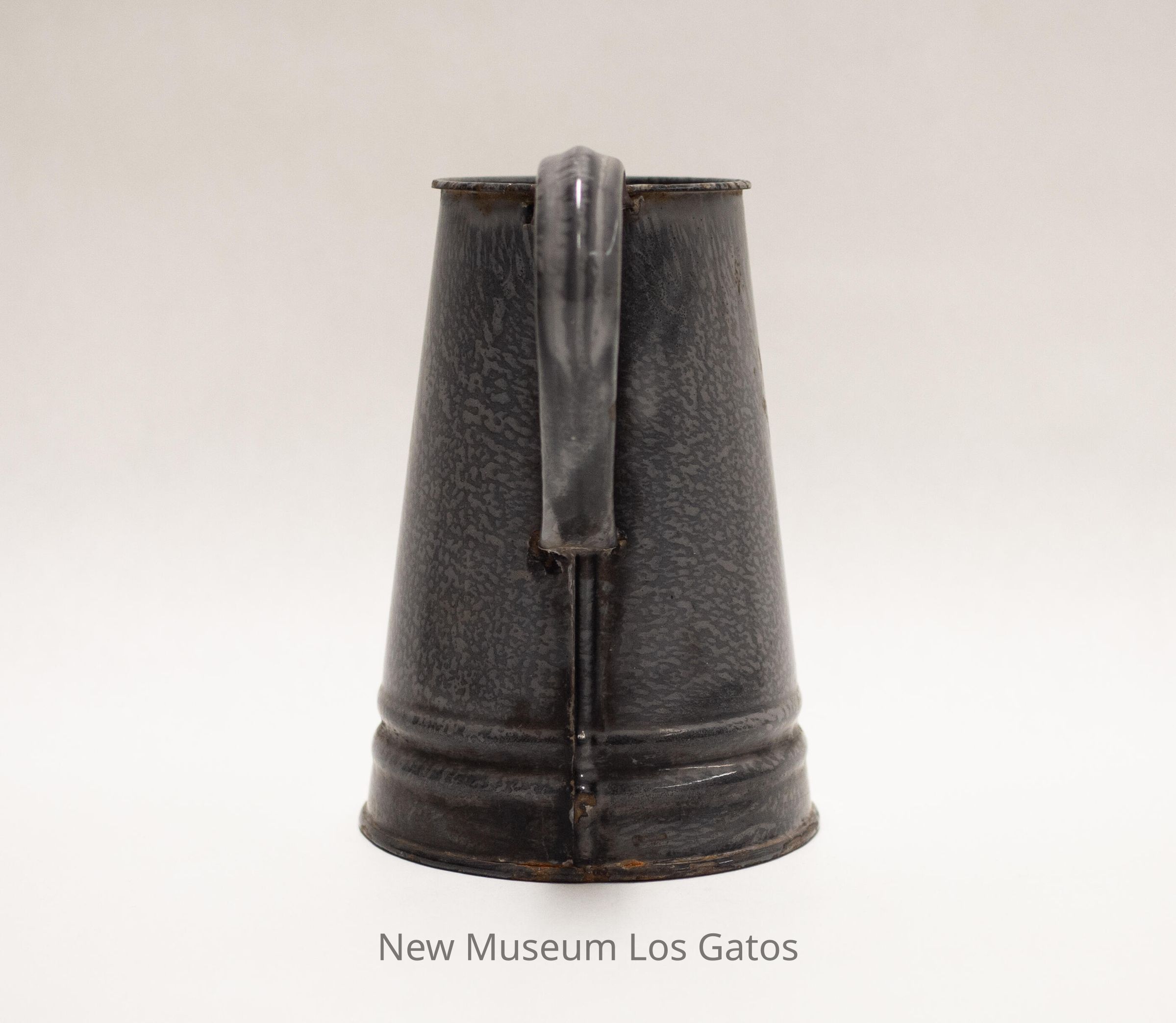A gray, enameled metal pitcher. The pitcher is wider at the base, and tapers towards the rim. There is a handle attached to the side of the pitcher, and opposite the pitcher is a spout; there are holes in the side of the pitcher, directly behind the spout. There are two decorative, raised bands around the base of the pitcher.Collection