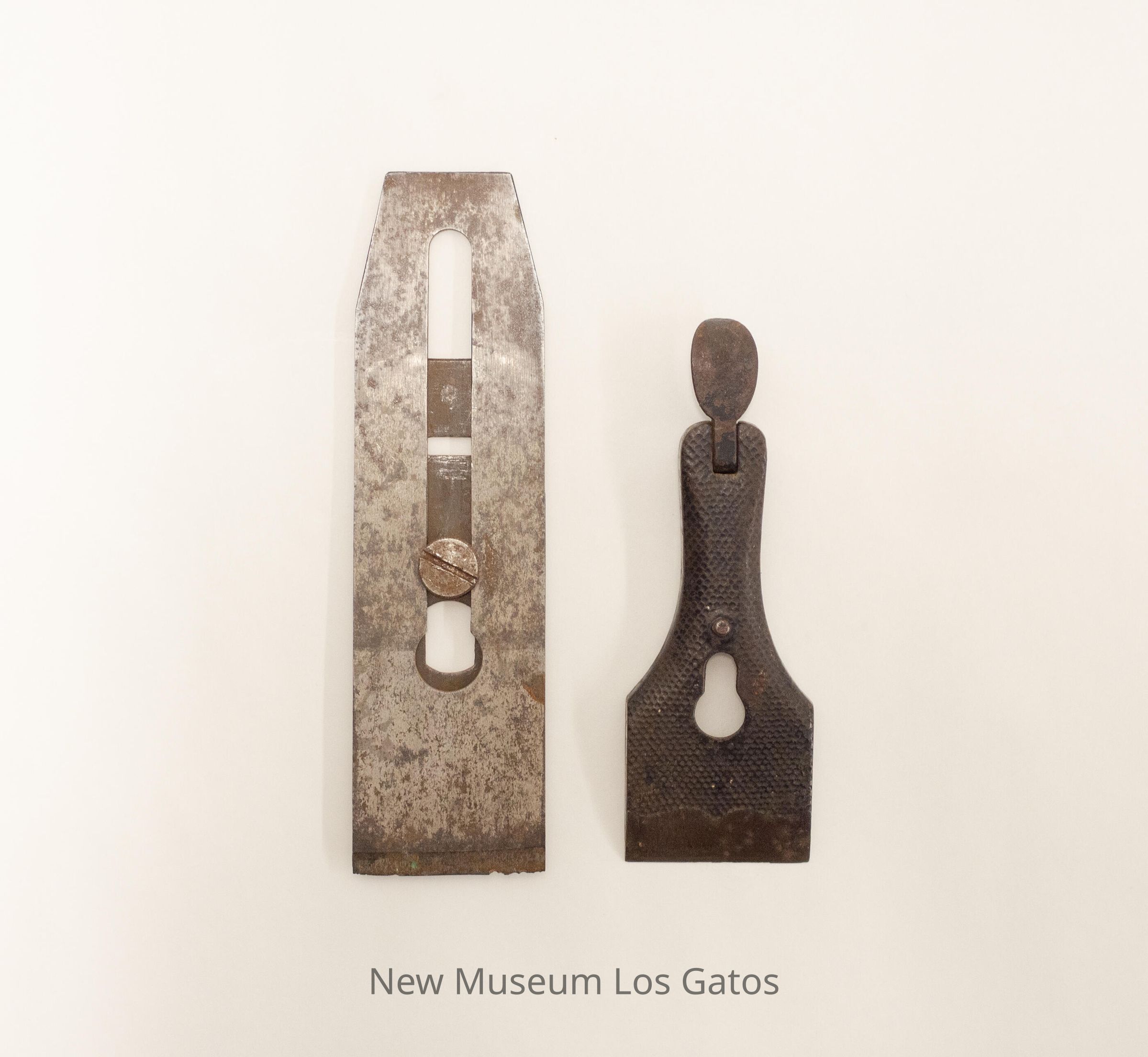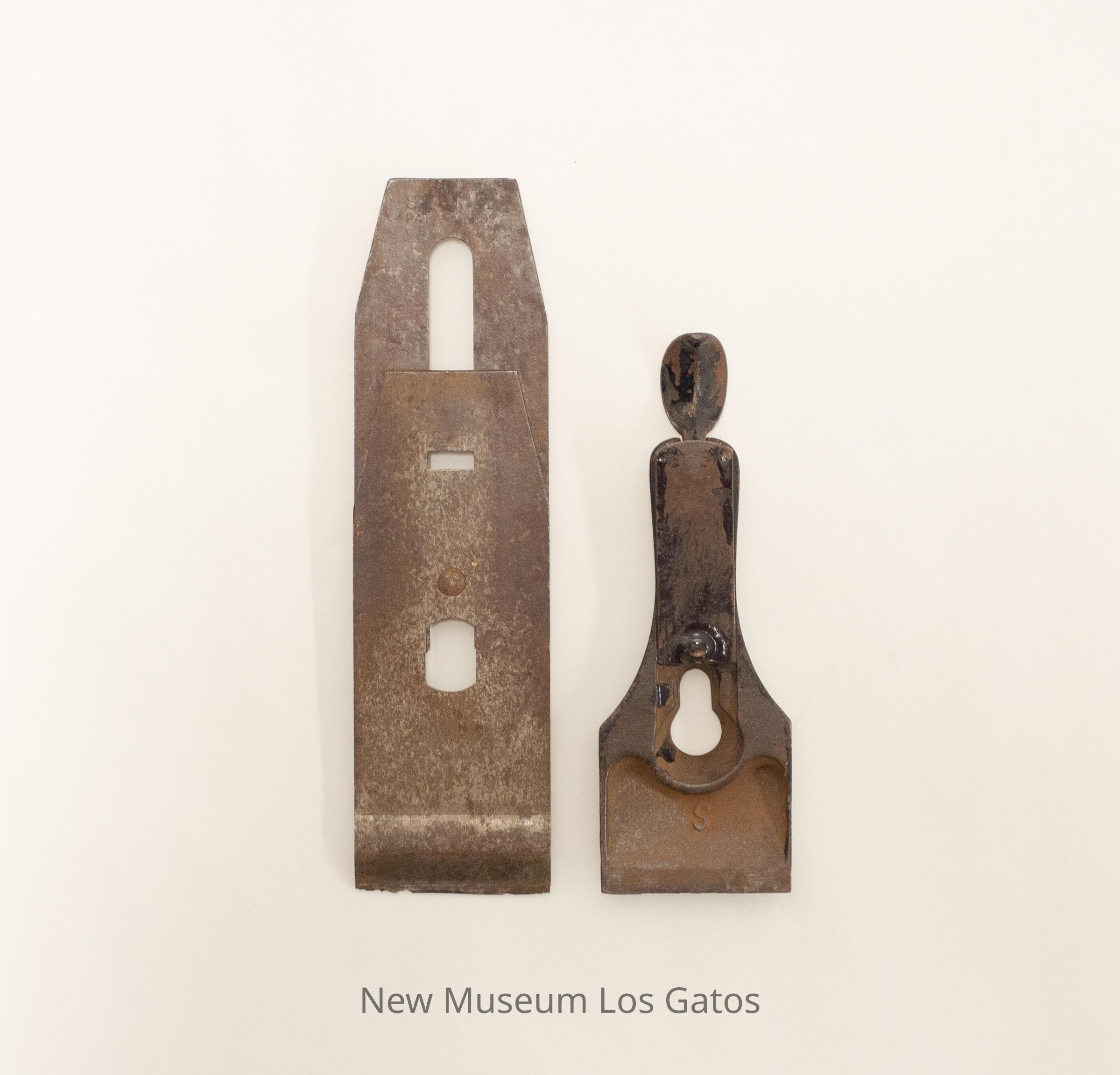 Two metal parts of a wood plane, the blade and chip breaker as well as the lever cap and cam. The blade/chip breaker piece is rectangular, and tapers in slightly at one end, while the blade point is at the opposite end. The lever cap/cam piece is square toward the bottom, and narrows into a handle that ends with the cam.Collection
