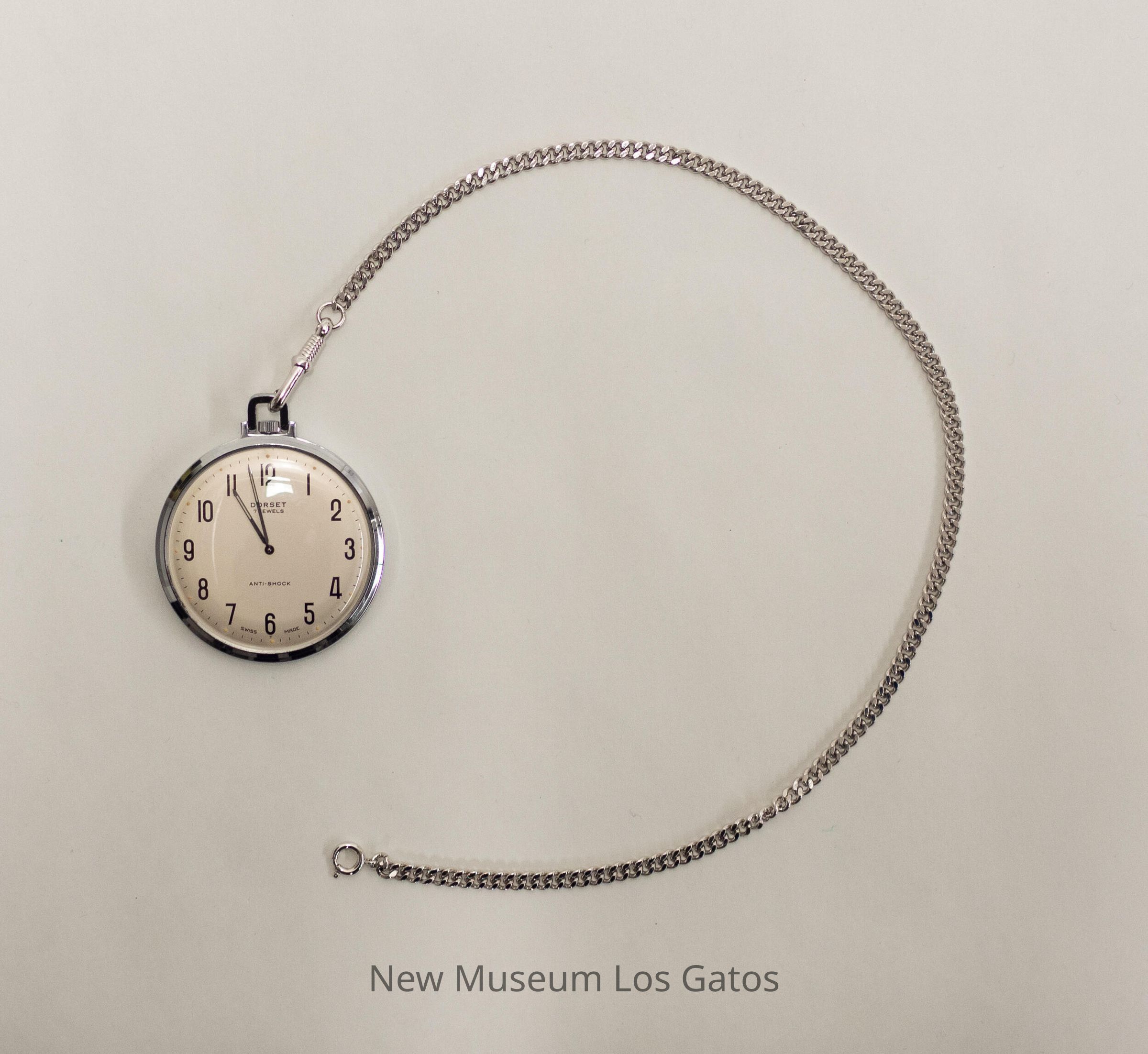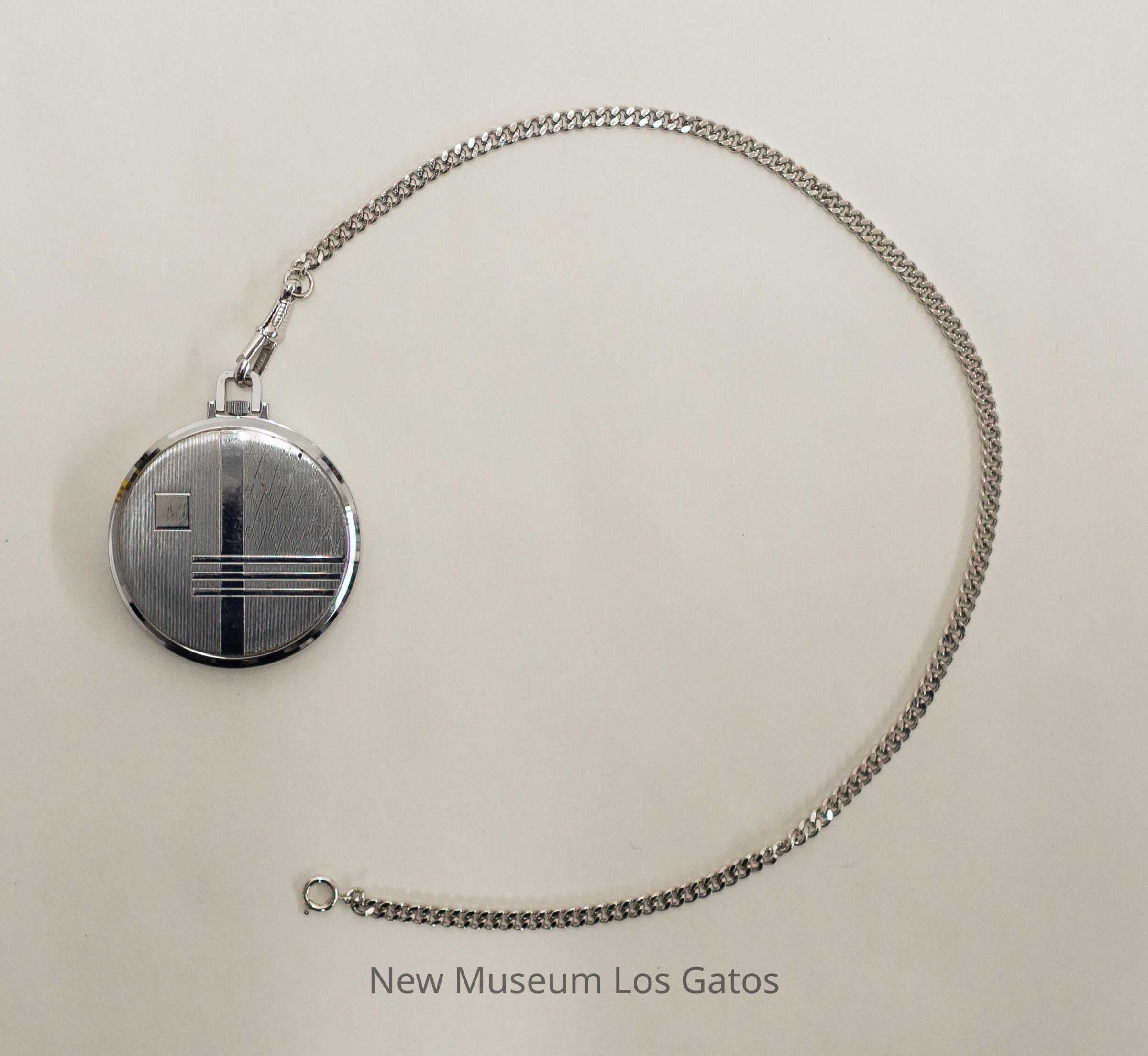 A silver, circular pocket watch. The watch face is white, and the numbers are black. There are yellow dots next to each number, with four hashes in between each number/yellow dot. The hands are black and white. There is decorative geometric engraving on the back of the watch. The silver chain attaches to the watch at the top.Collection