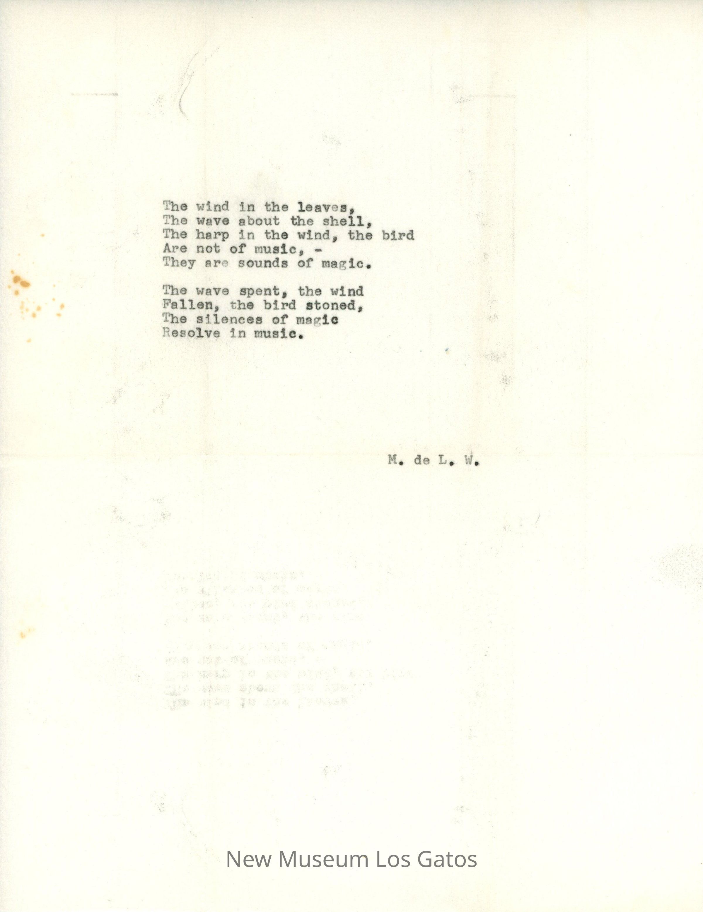 Short, single page poem, attributed to "M. de L. W." No title is given. The poem is two stanzas, typed onto single page Eaton-Berkshire typewriter paper.Collection