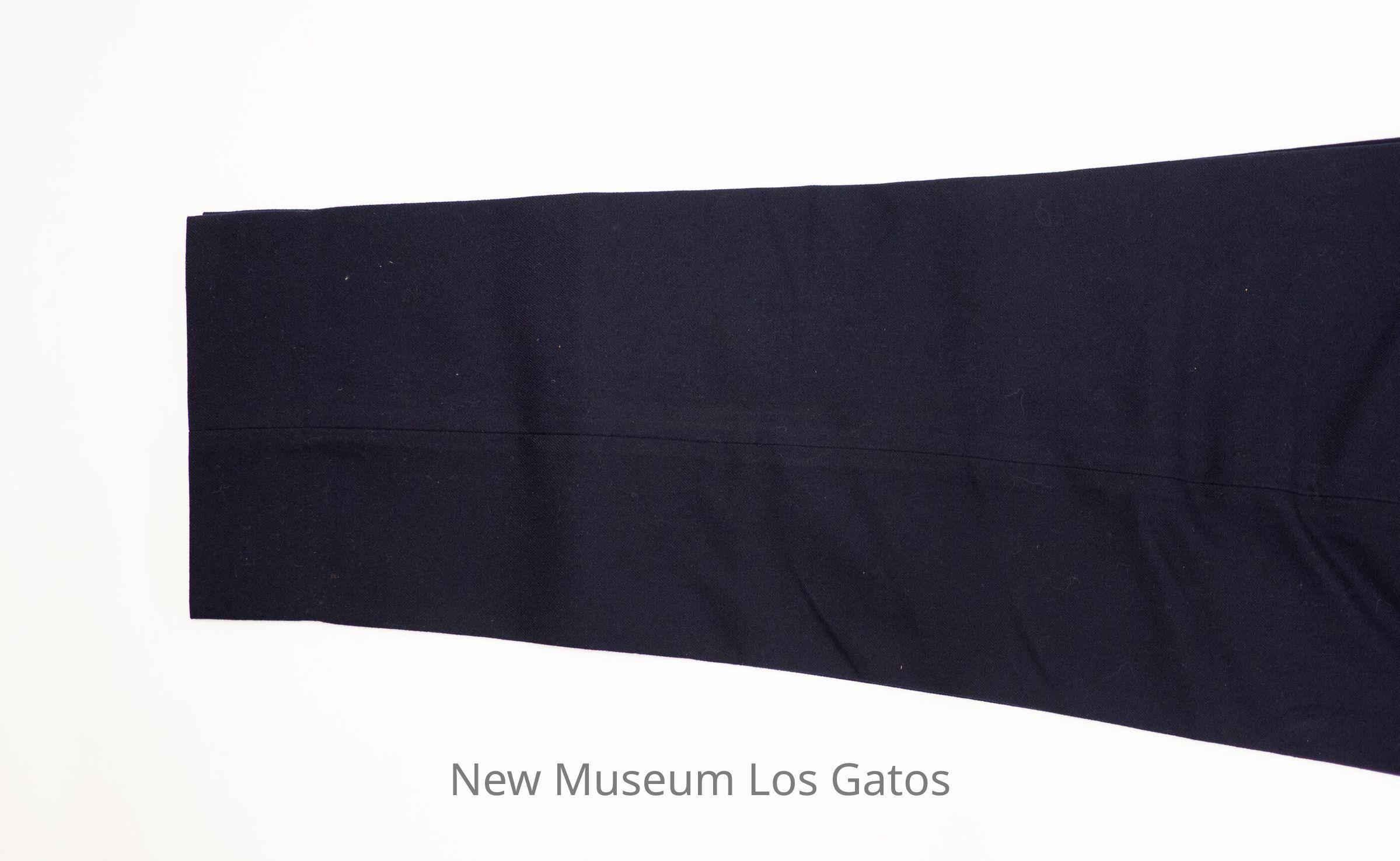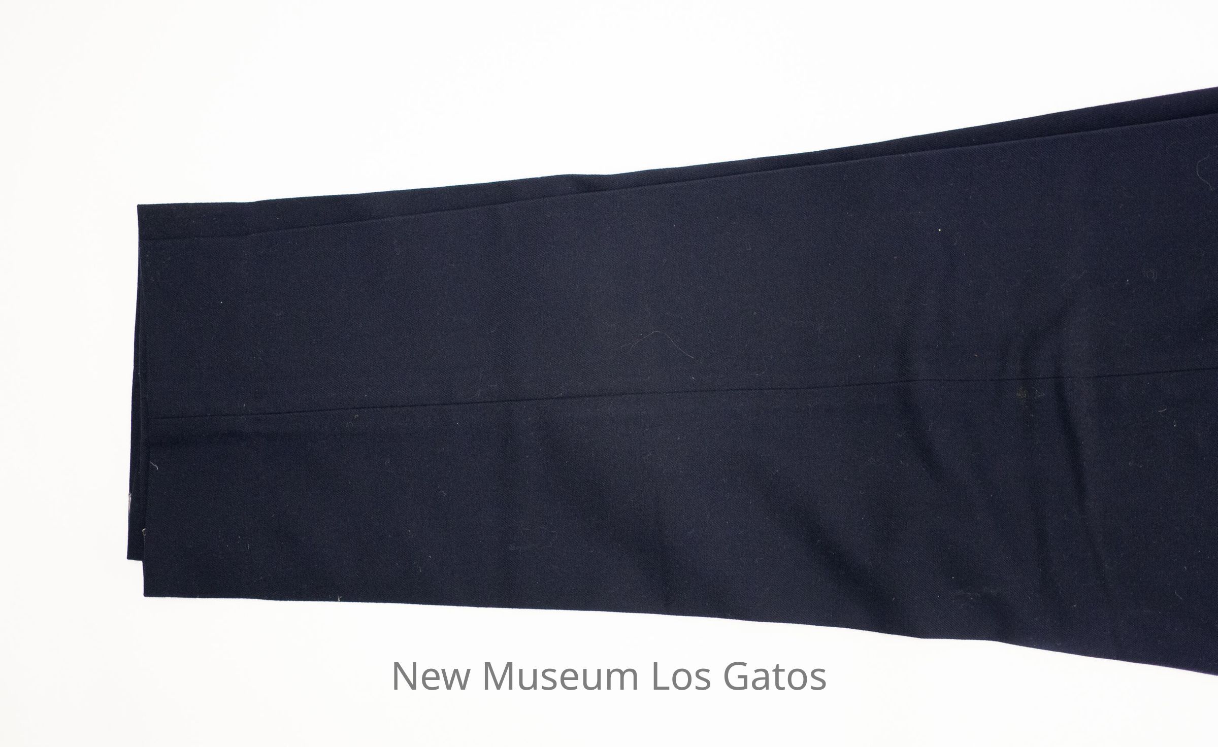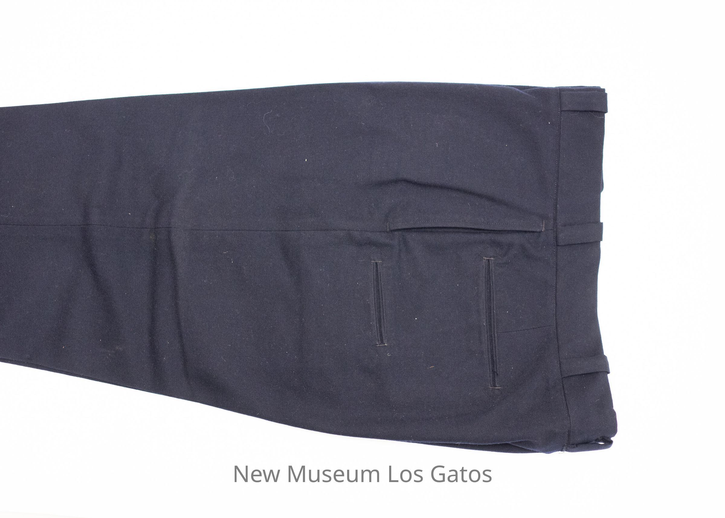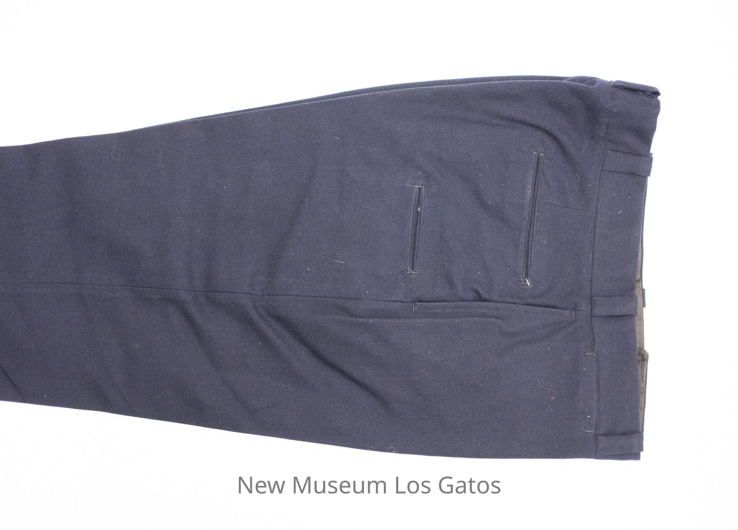 A pair of dark navy pants, belonging to Los Gatos Police Chief Ralph Phillips. There are two front pockets, three back pockets, and numerous belt loops around the waist. The pants close in the front with a zipper and two black buttons.Collection