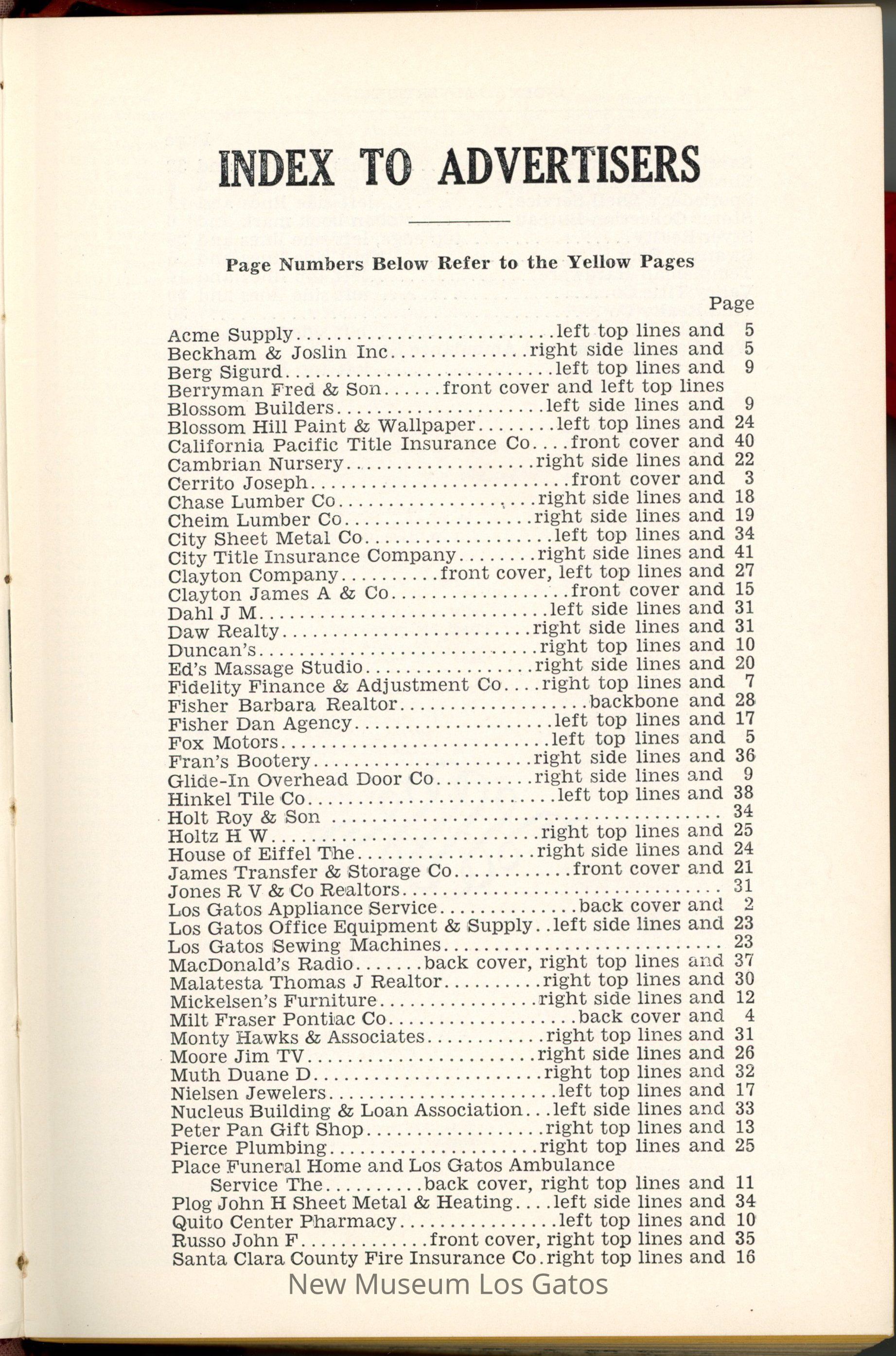 CALIFORNIA / POLK'S LOS GATOS CITY DIRECTORY 1958 INCLUDING MONTE SERENO CAMPBELL and SARATOGA R. L. POLK & CO. PUBLISHERS / BARBARA FISHER REALTOR / COURTESY and DEPENDABILITY MEMBER OF SAN JOSE and LOS GATOS-SARATOGA REALTY BOARDS / Tel. ELgato 4-8640 / 312 E. MAIN ST. LOS GATOS
