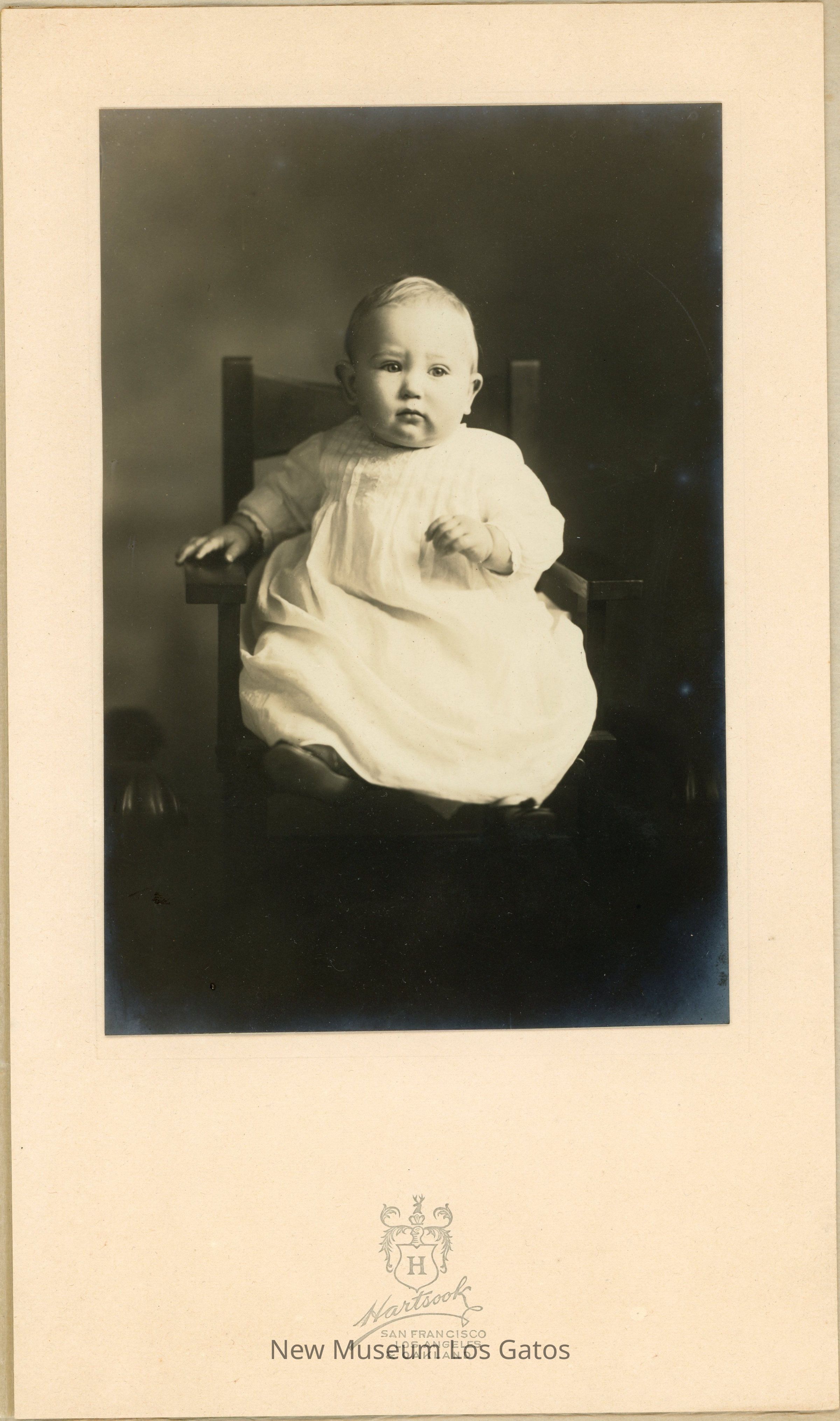 A black and white photograph inside of a folder, featuring a portrait of an unidentified baby. The child has light colored hair, and is wearing a white gown. The child is sitting on a chair. The photograph is surrounded by a white border, with vendor inscriptions below the image, and has a protective layer of glassine inside of a display folder.Photograph Details