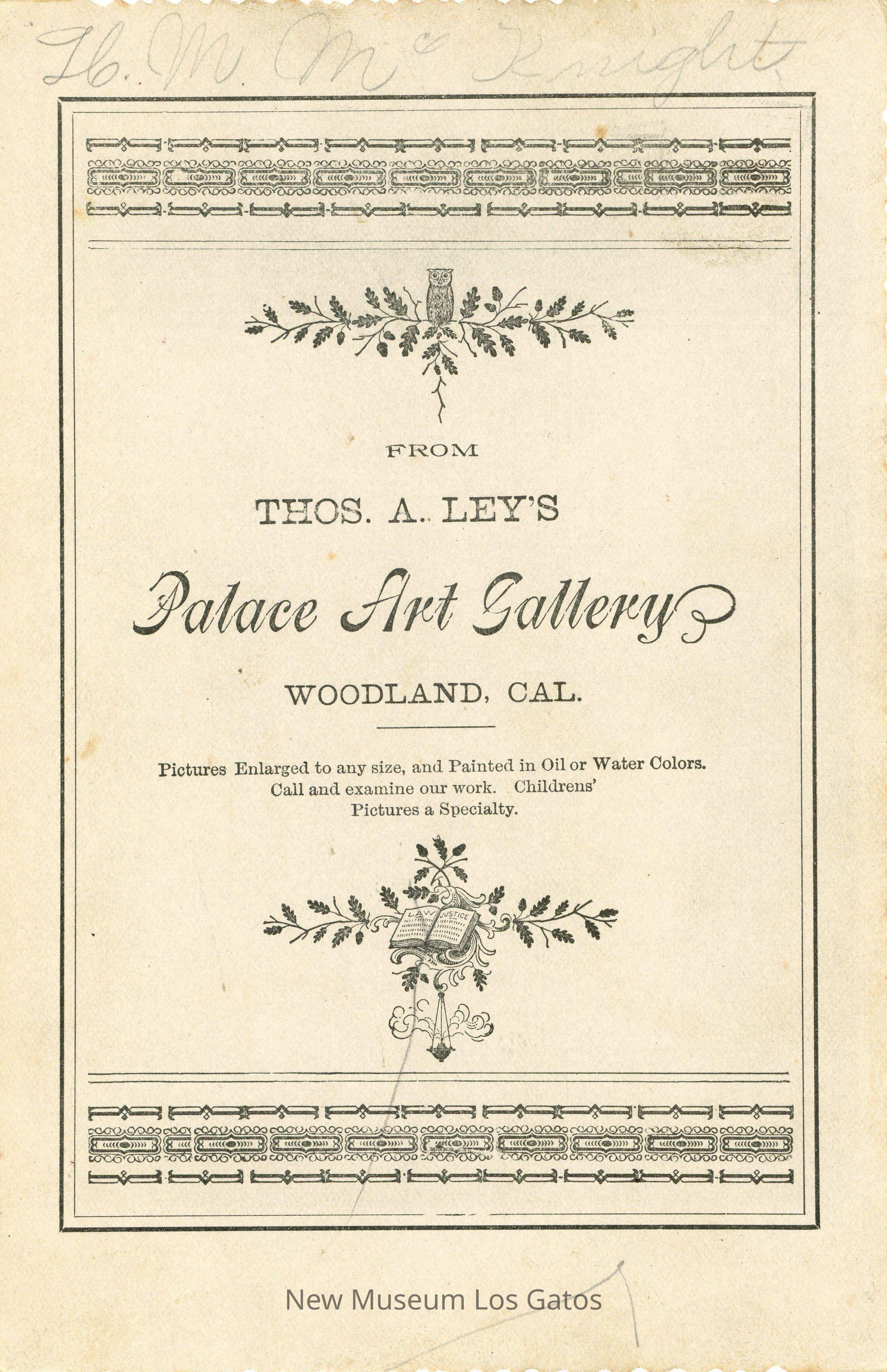 Palace Gallery, T.A. Ley. Artist, Woodland, Cal.Language