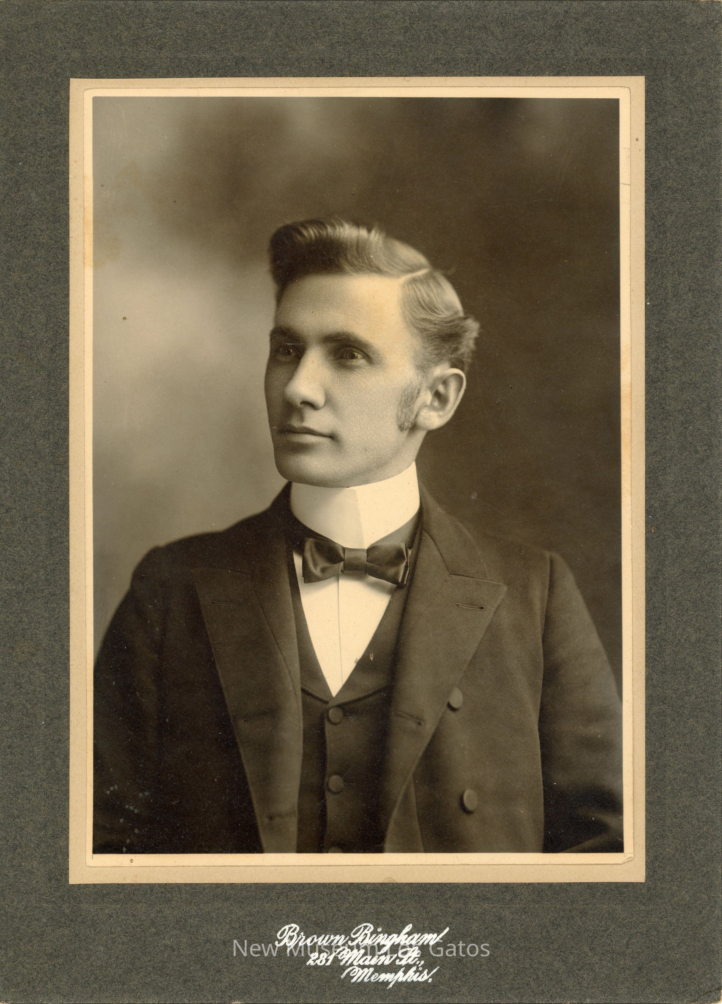 A black and white photograph of a portrait of an unidentified man. The man is wearing a dark colored jacket, with a dark colored vest and white shirt underneath, as well as a dark colored bowtie. The man has short hair and no facial hair. The photograph is surrounded by a dark gray border, with vendor inscriptions below the image.