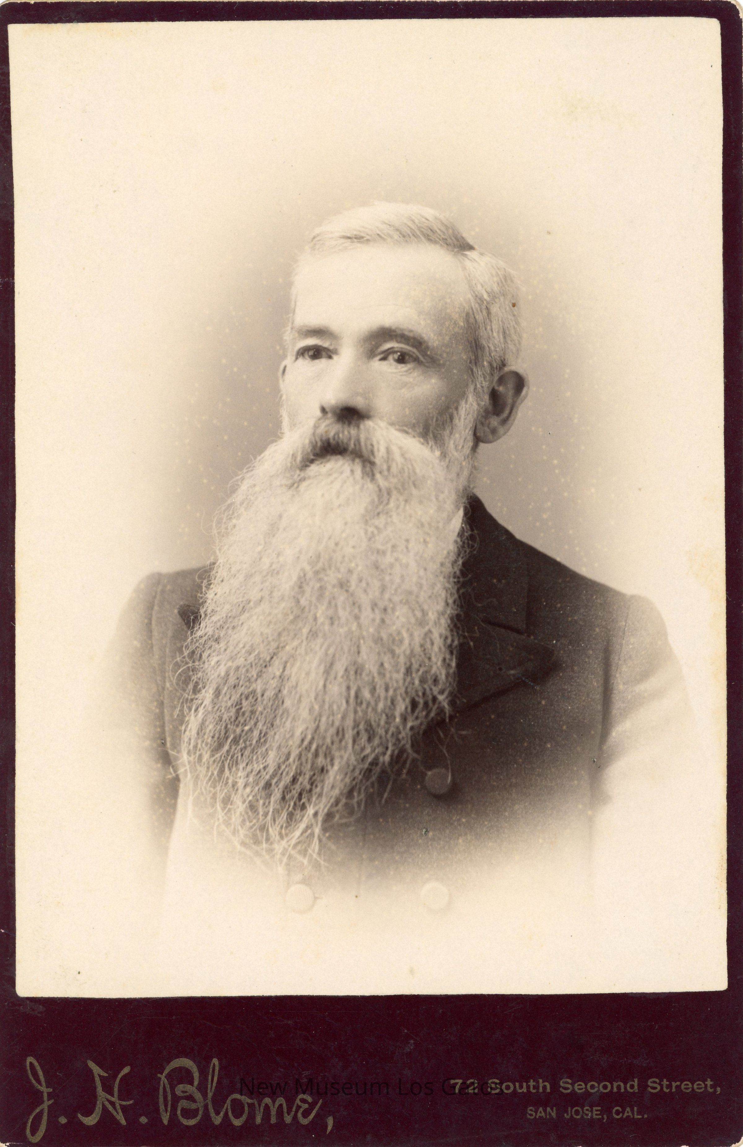 A black and white photograph of a portrait of an unidentified man. The man is wearing a dark colored button-up jacket, and has a long white beard and shortly-clipped white hair. The photograph is surrounded by a brown border, with vendor inscriptions below the image.