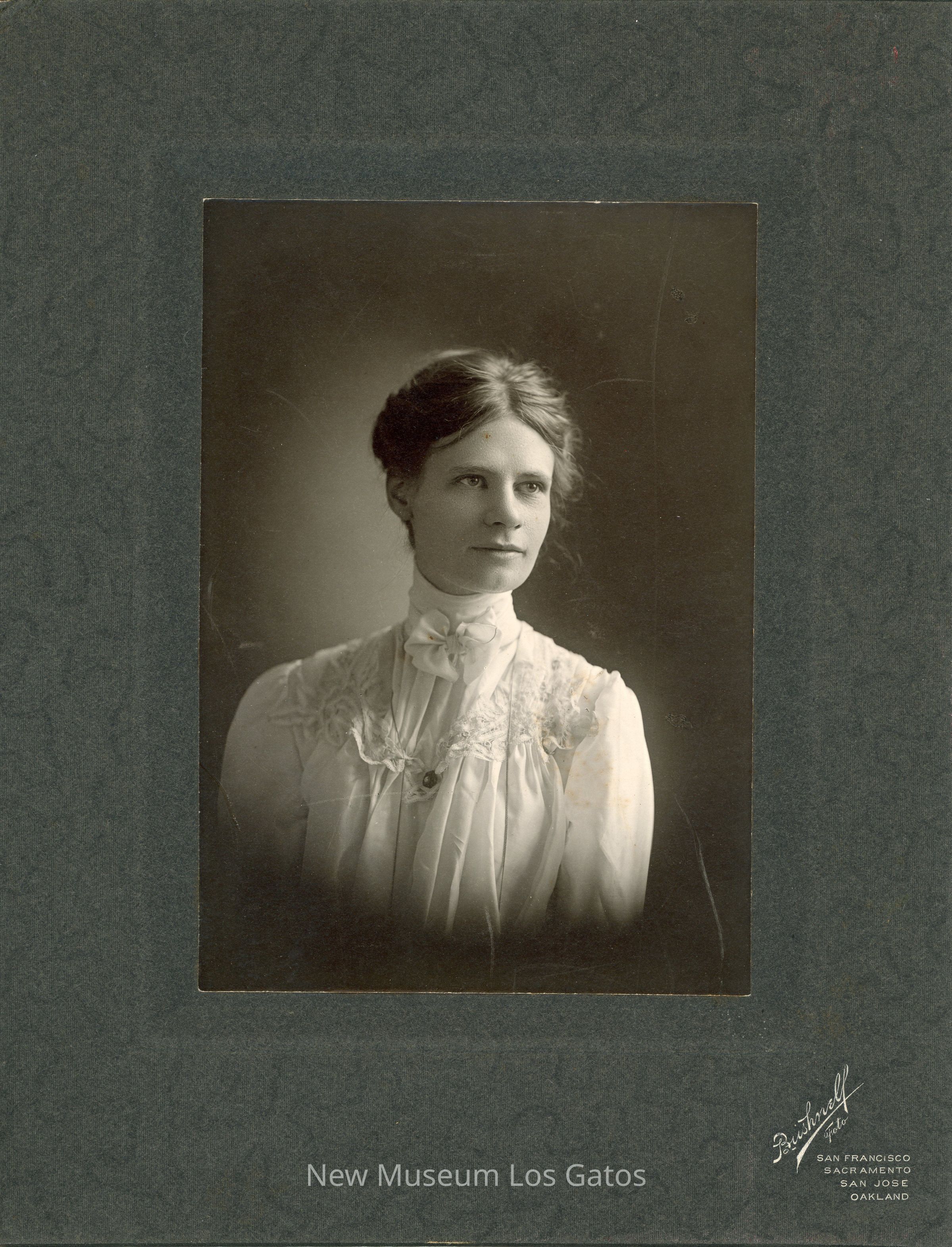 A black and white photograph of a portrait of an unidentified woman. The woman is wearing a white top, with decorative lace around the shoulders. Her hair is pulled up, and she is looking off towards the right. The photograph is surrounded by a dark gray border, with vendor inscriptions below the image.