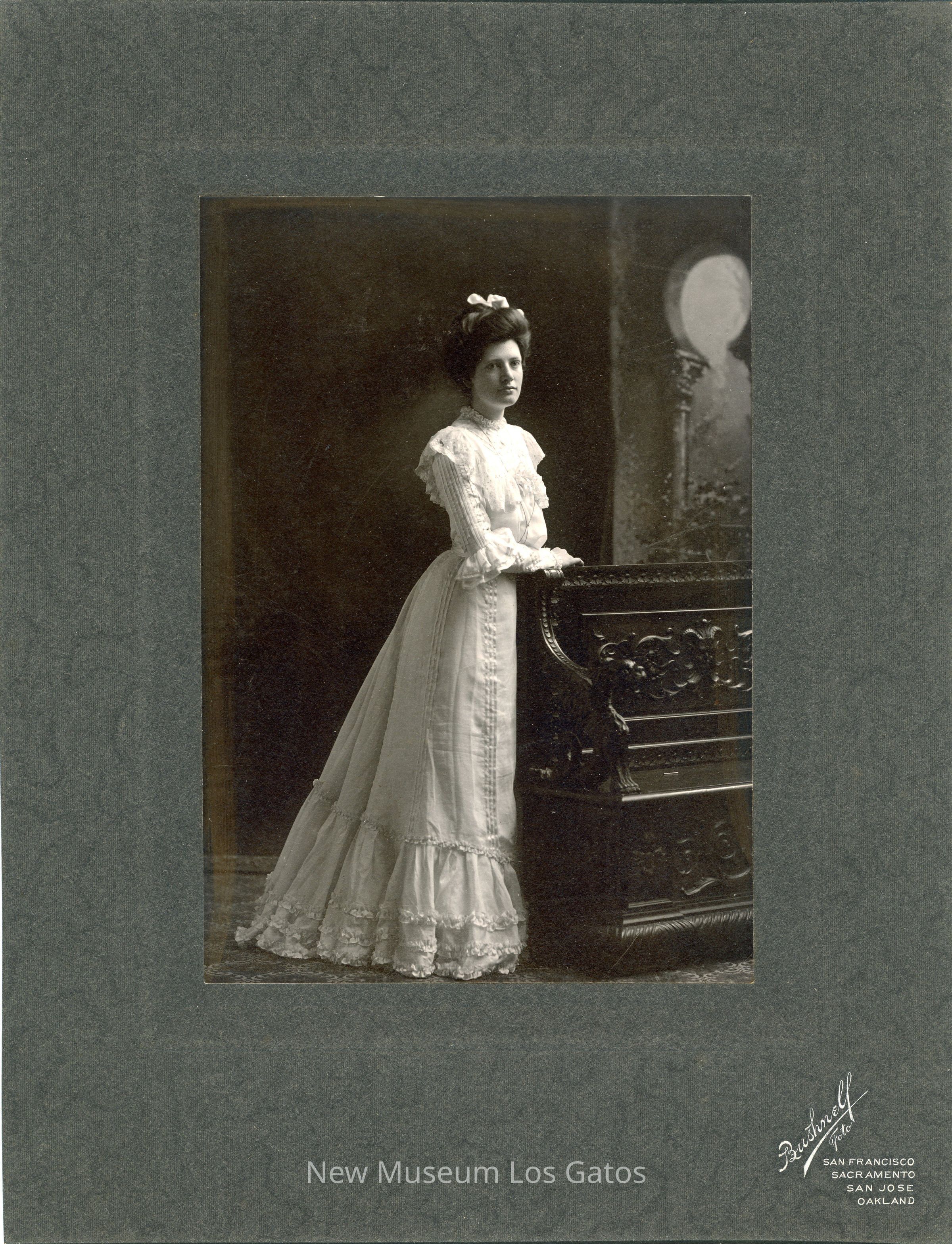 A black and white photograph of a portrait of an unidentified woman. The woman is standing, wearing a long white dress with decorative ruffles throughout. Her hair is up, and there is a white bow in her hair. She is standing slightly behind a wooden bench, with one arm resting on the back of the bench. The photograph is surrounded by a dark gray border, with vendor inscriptions below the image.Photograph Details