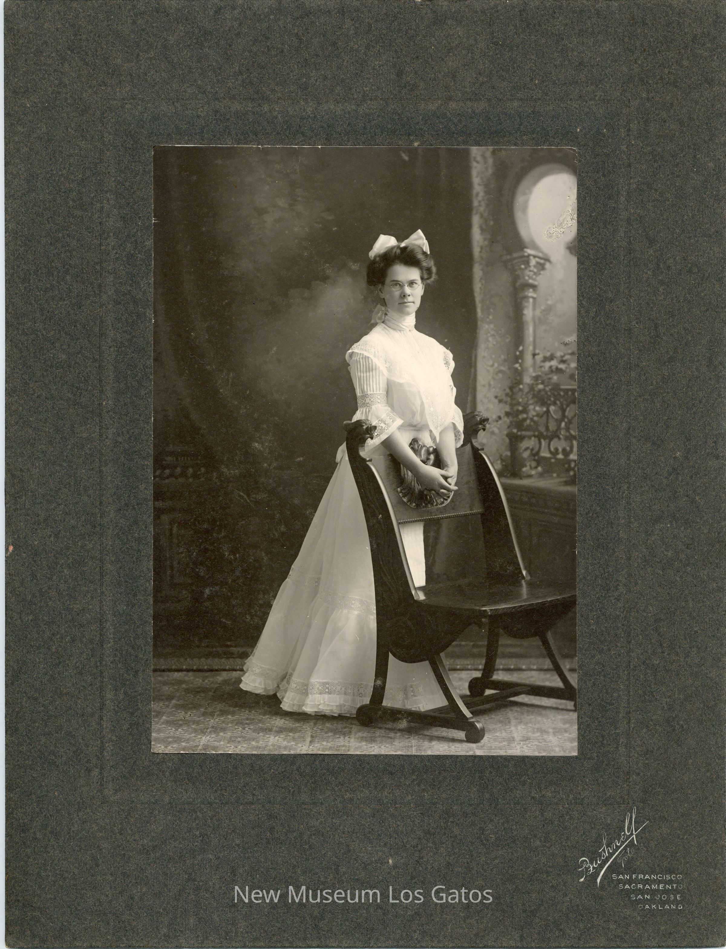 A black and white photograph of a portrait of an unidentified woman. The woman is standing, and wearing a long white dress and glasses. Her hair is up, and there is a white bow in her hair. She is standing with her hands over the back of a decorative wooden chair. The photograph is surrounded by a dark gray border, with vendor inscriptions below the image.