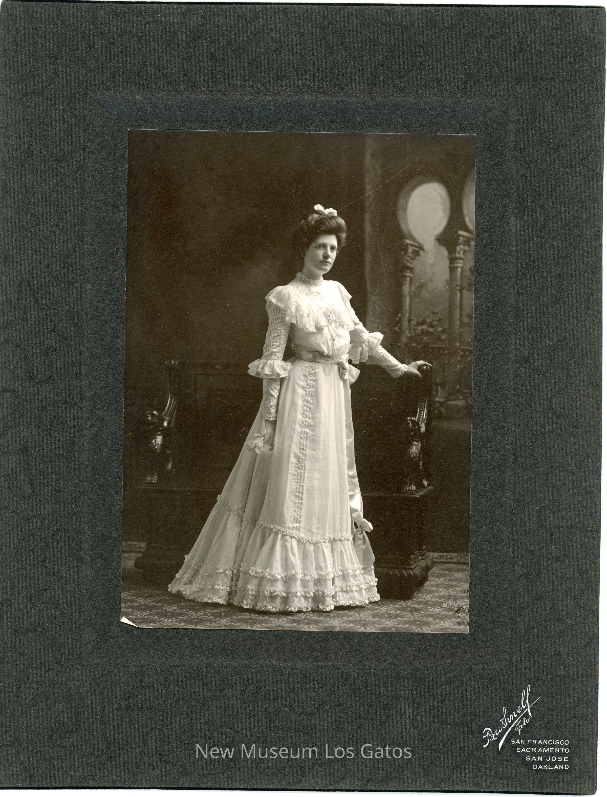 A black and white photograph of a portrait of an unidentified woman. The woman is standing, wearing a long white dress. Her hair is up, and there is a white bow in her hair. She is standing in front of a wooden bench, with one hand resting on the back of the bench. The photograph is surrounded by a dark gray border, with vendor inscriptions below the image.Photograph Details
