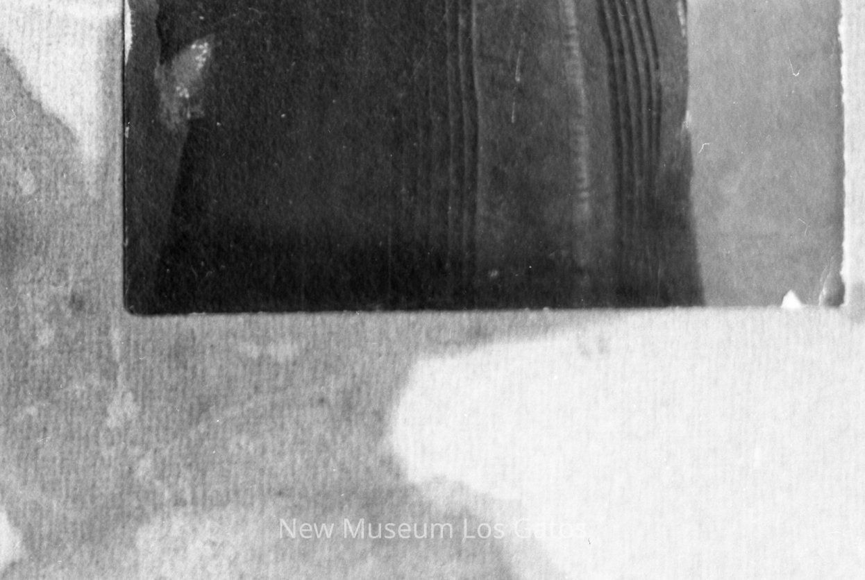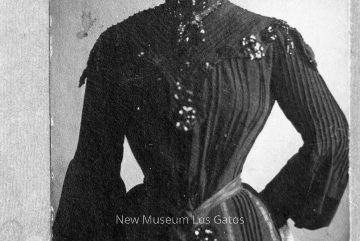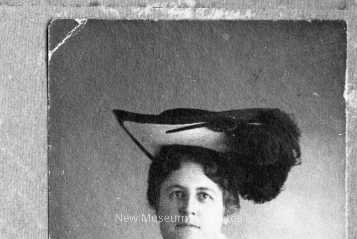 A black and white photograph negative of a portrait of a woman. The woman is wearing a dark colored dress and hat with a feather, and has one of her arms on her hip. The negative is stored in a glassine pouch.