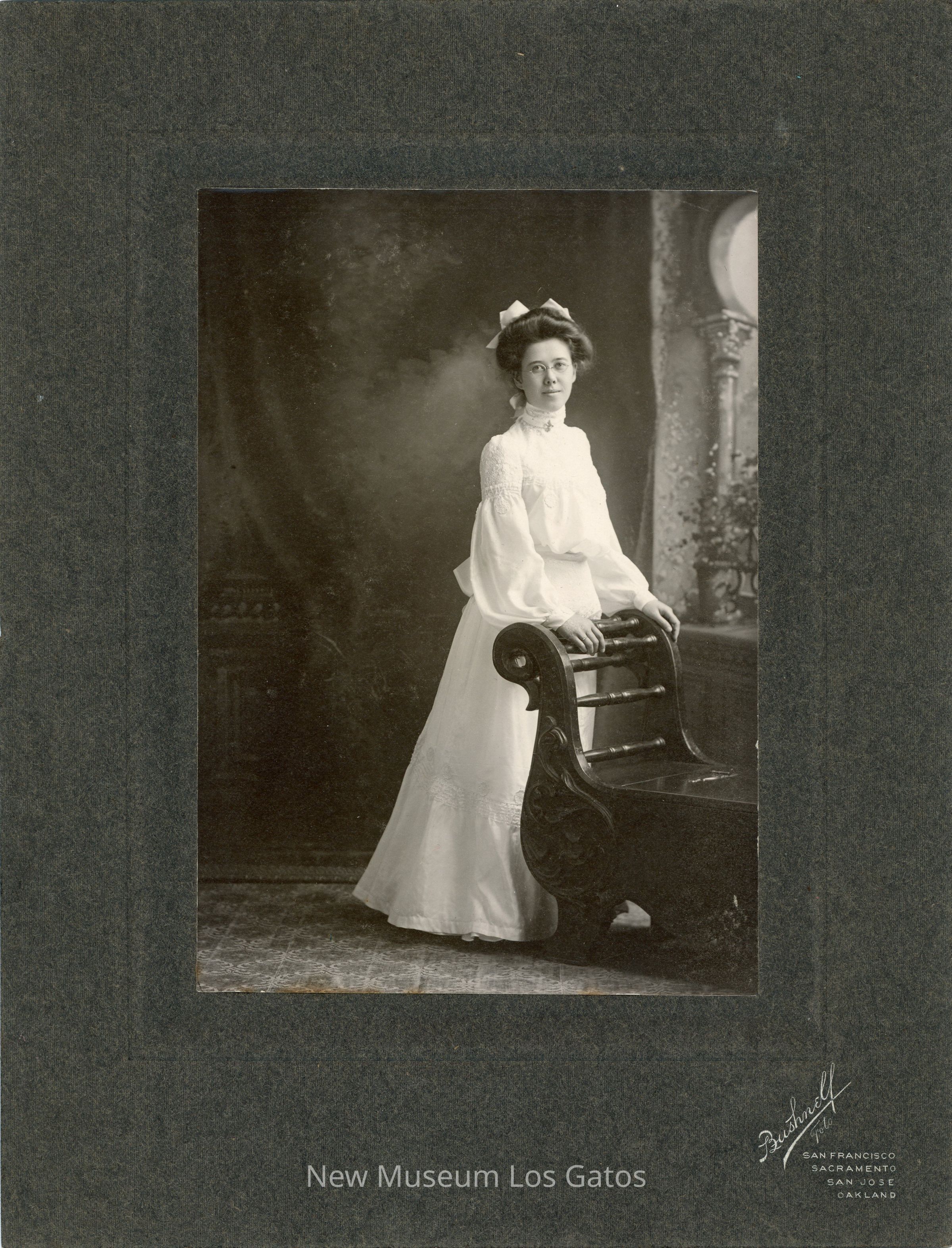 A black and white photograph of a portrait of an unidentified woman. The woman is standing, and wearing a long white dress and glasses. Her hair is up, and there is a white bow in her hair. She is standing with her hands on a wooden piece of furniture. The photograph is surrounded by a dark gray border, with vendor inscriptions below the image.