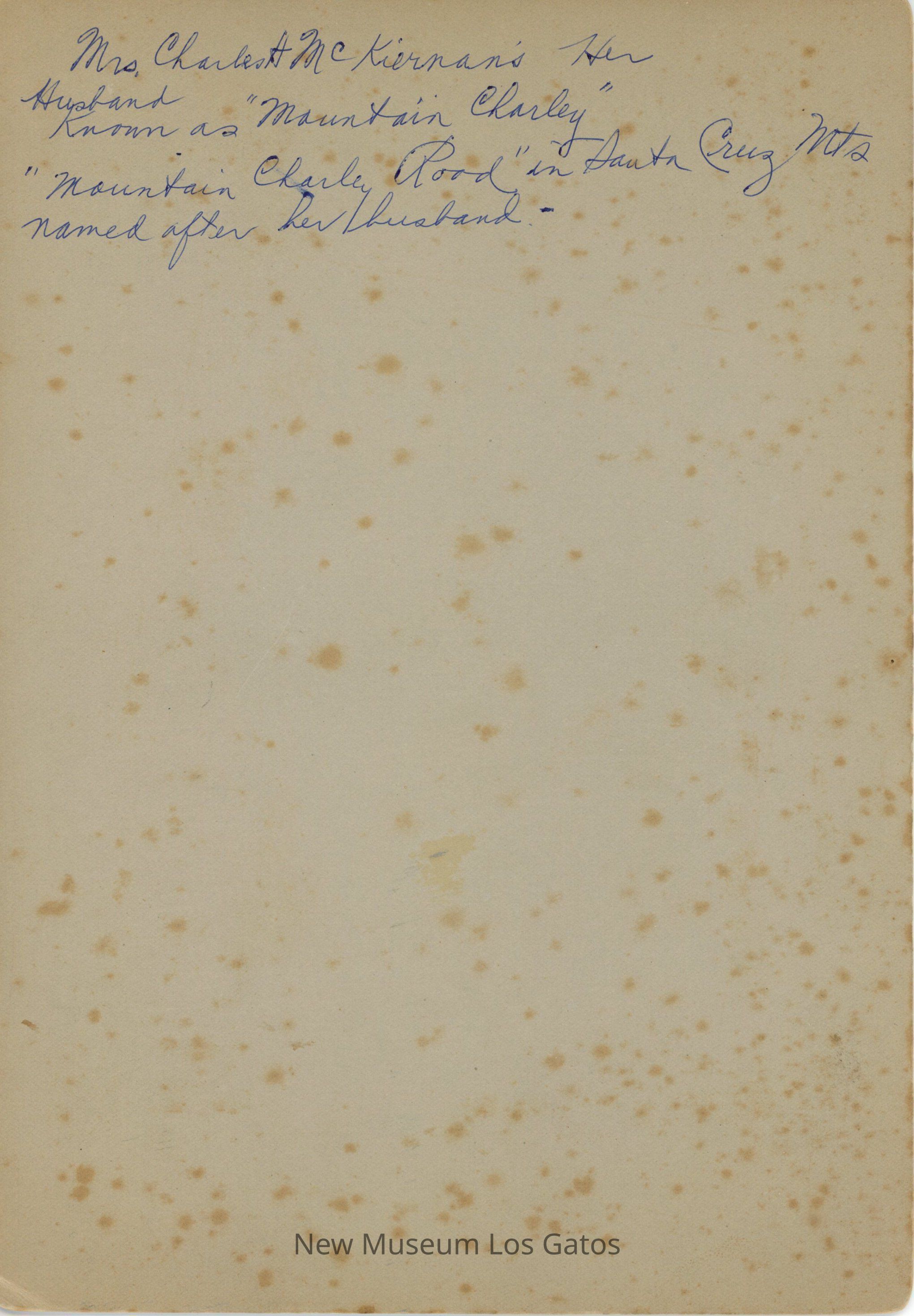 Mrs. Charles H McKiernan's Her Husband Known as "Mountain Charley" "Mountain Charley Road" in Santa Cruz Mts named after her husband